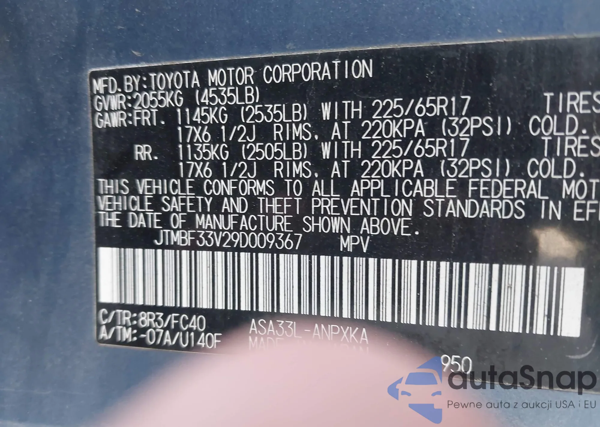LOT: 42460677 VIN: JTMBF33V29D009367