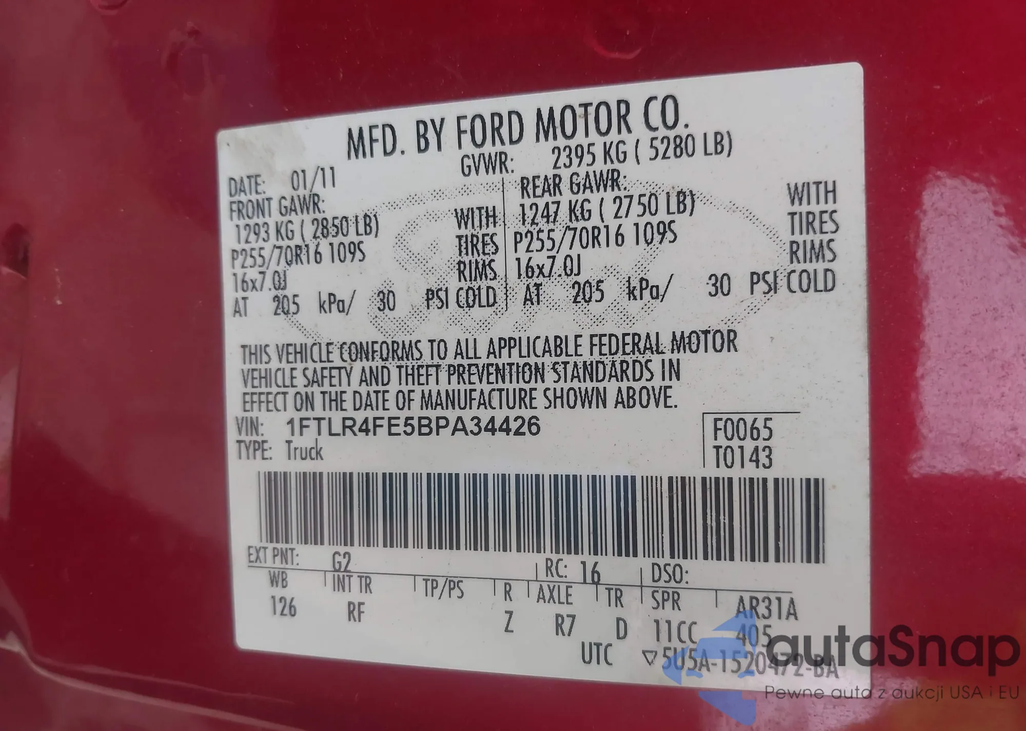 LOT: 42695806 VIN: 1FTLR4FE5BPA34426
