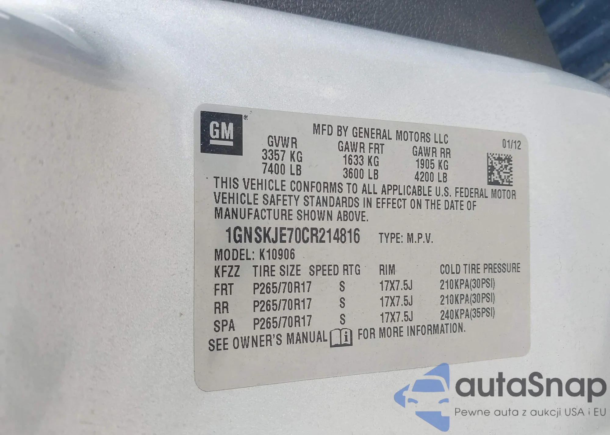 LOT: 42698478 VIN: 1GNKRGKD6HJ178239