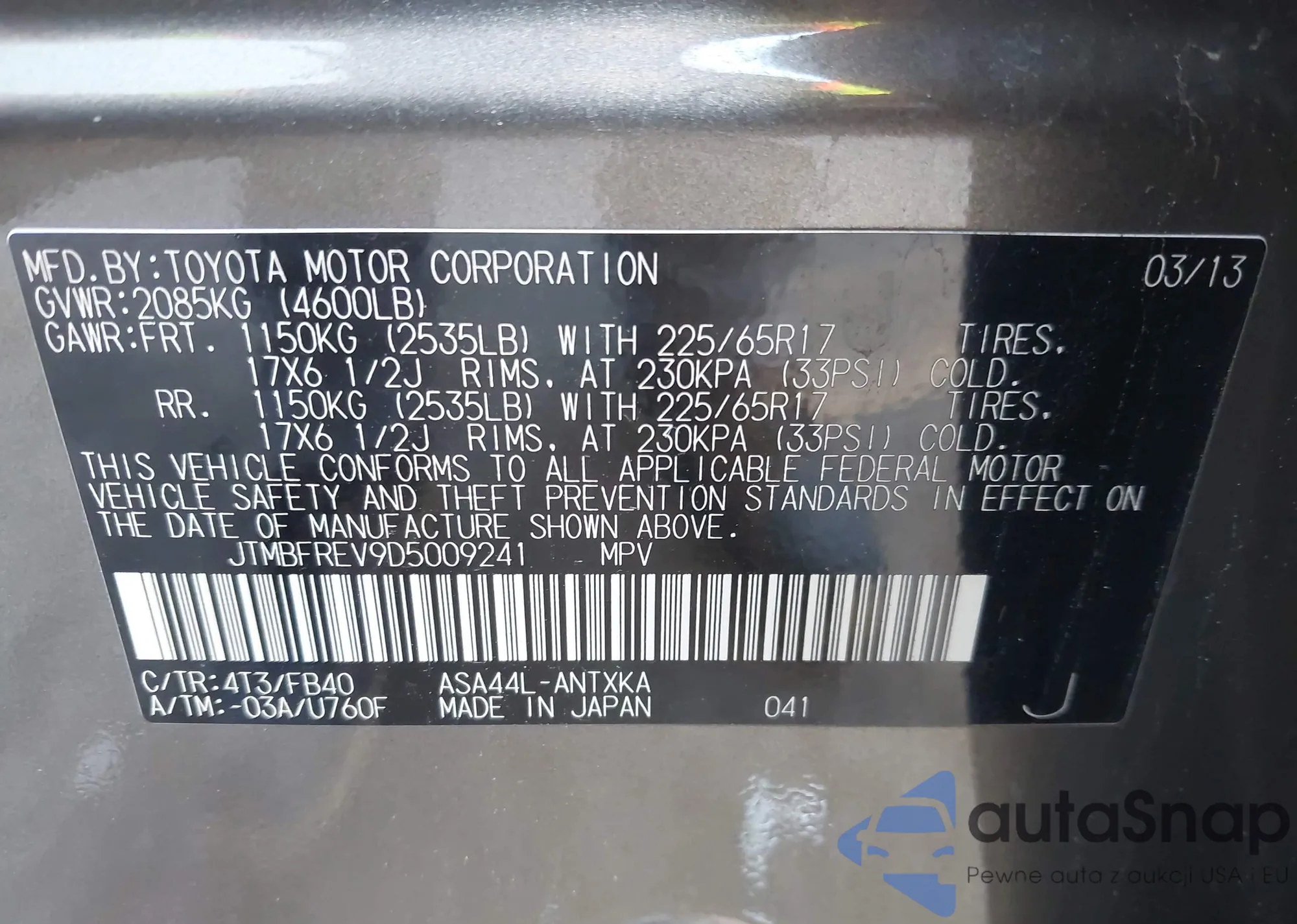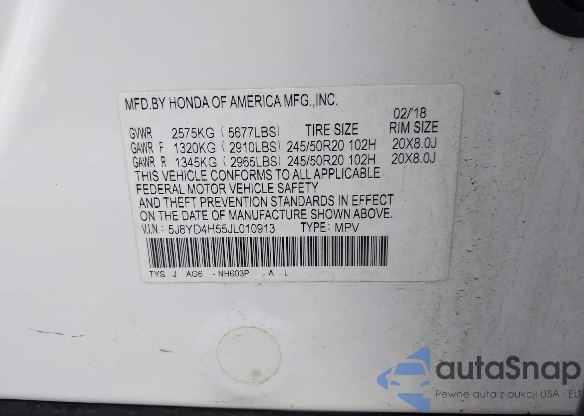 LOT: 42562969 VIN: 5J8YD4H55JL010913