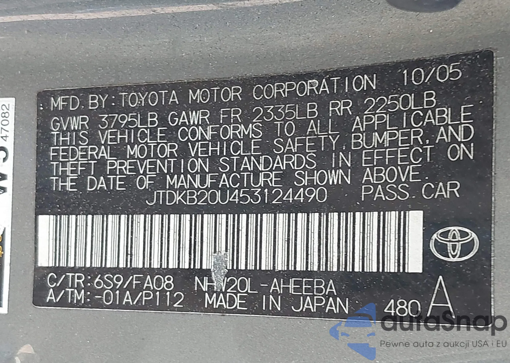 LOT: 42818255 VIN: JTDKB20U453124490