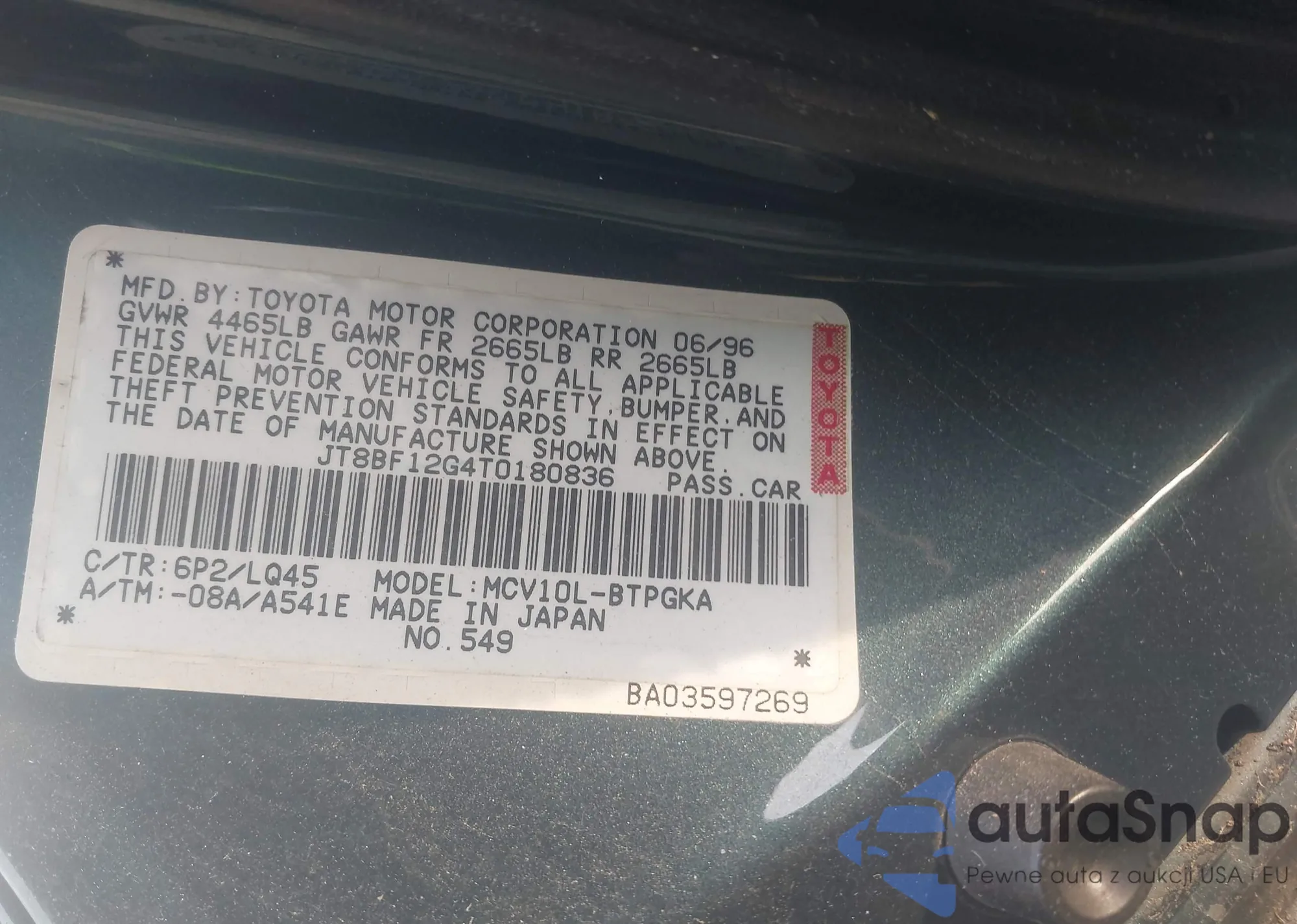 LOT: 41763489 VIN: JT8BF12G4T0180836