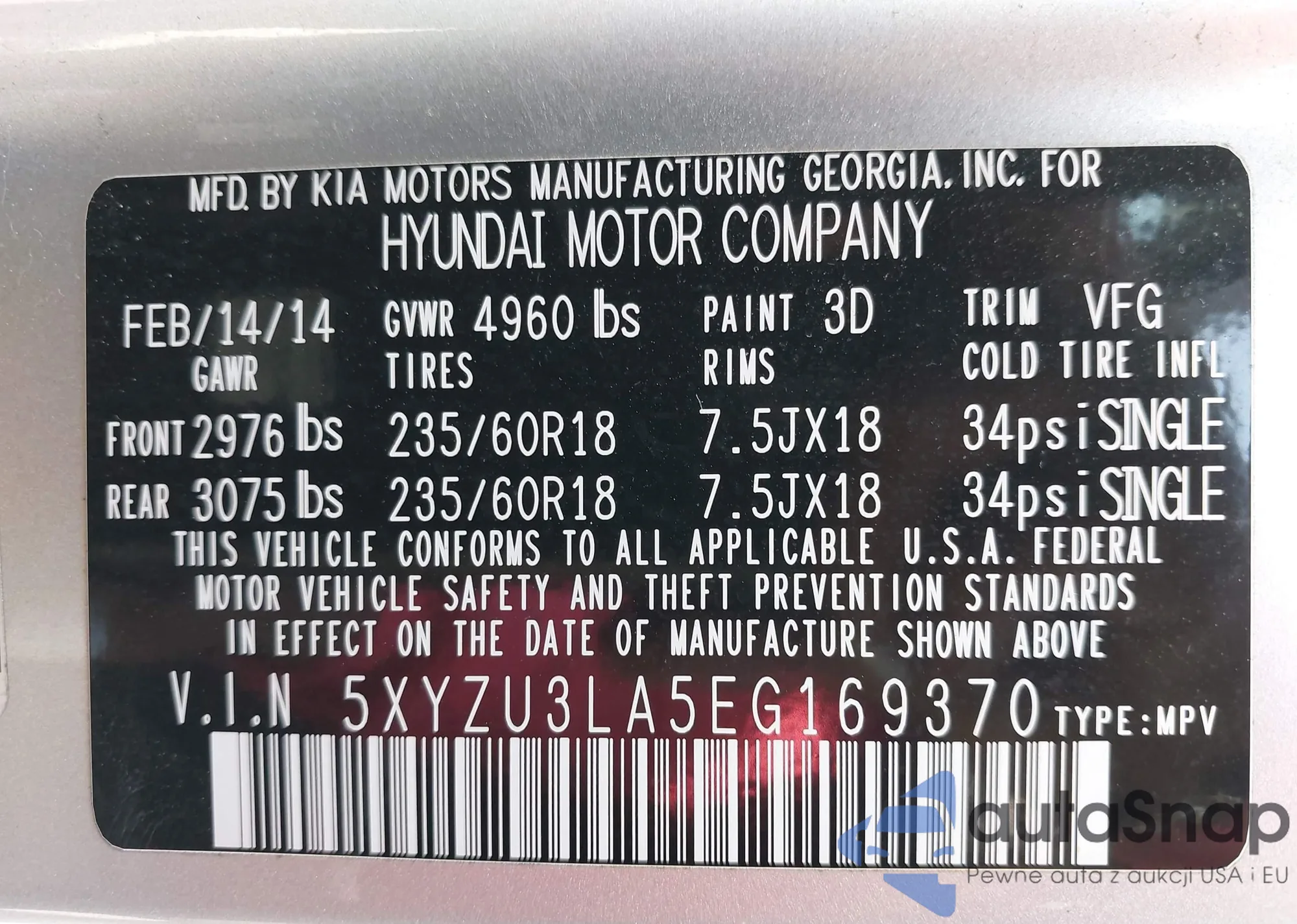 • VIN 5XYZU3LA5EG169370