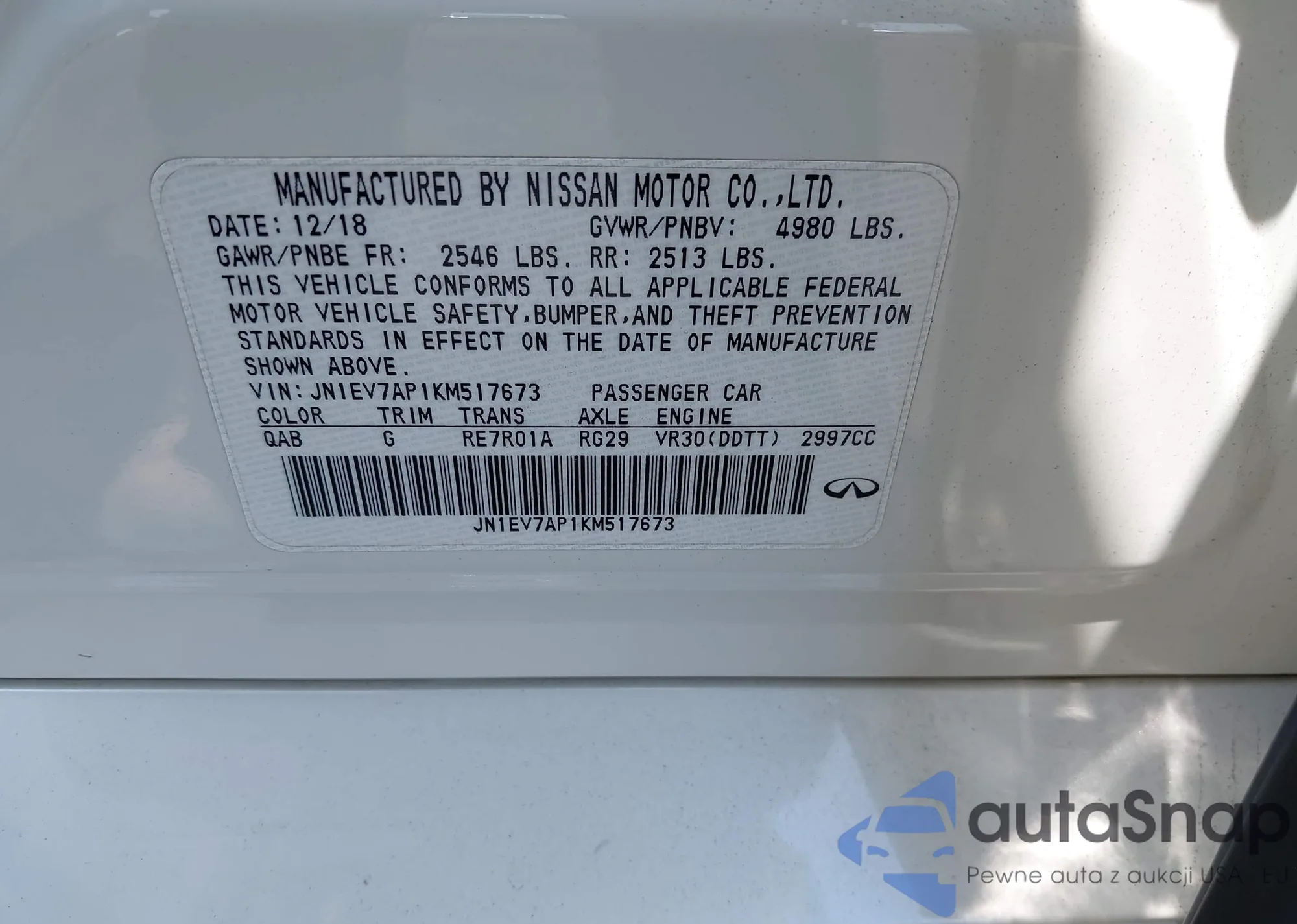 LOT: 42555738 VIN: JN1EV7AP1KM517673