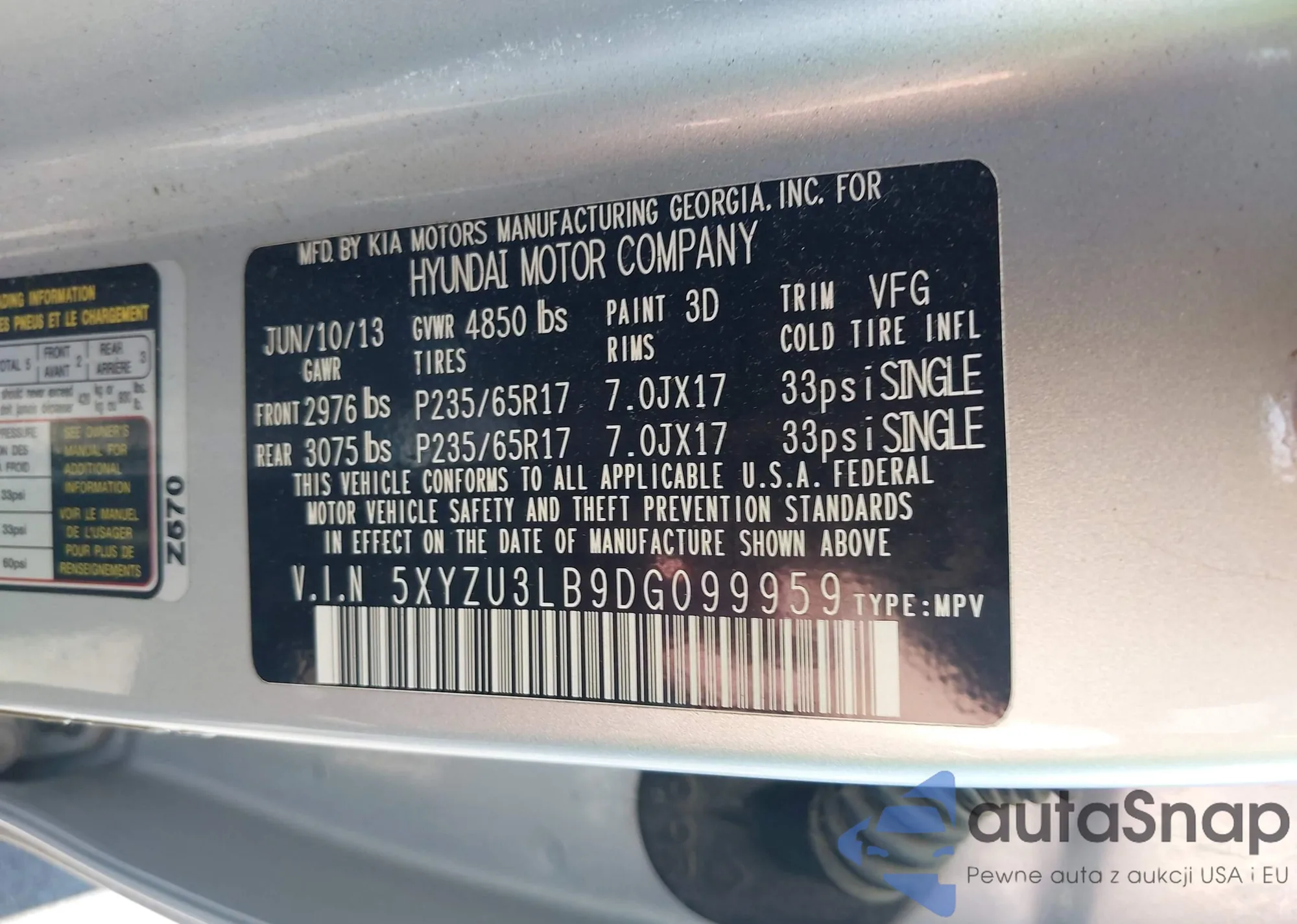• VIN 5XYZU3LB9DG099959