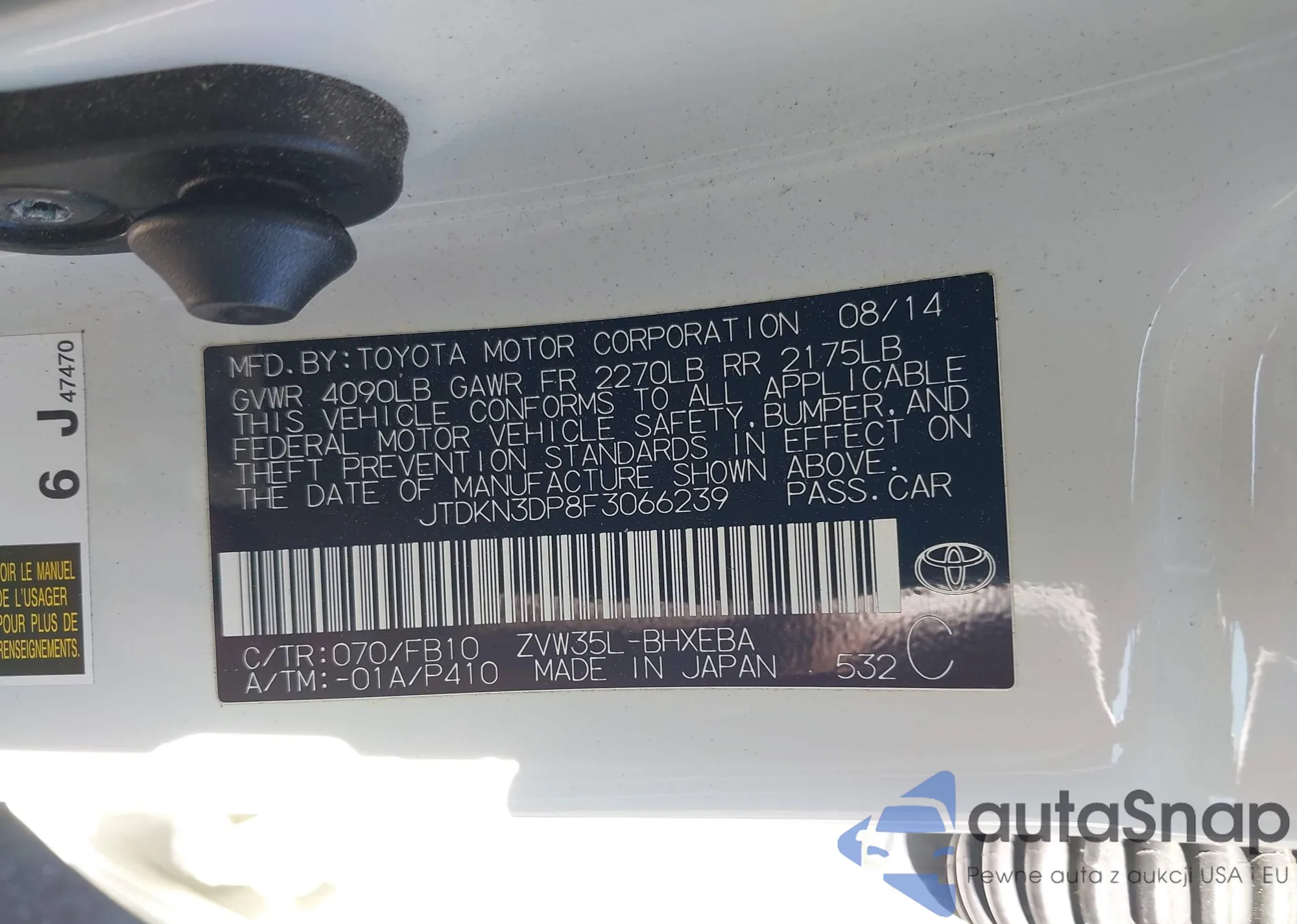 LOT: 42831974 VIN: JTDKN3DP8F3066239