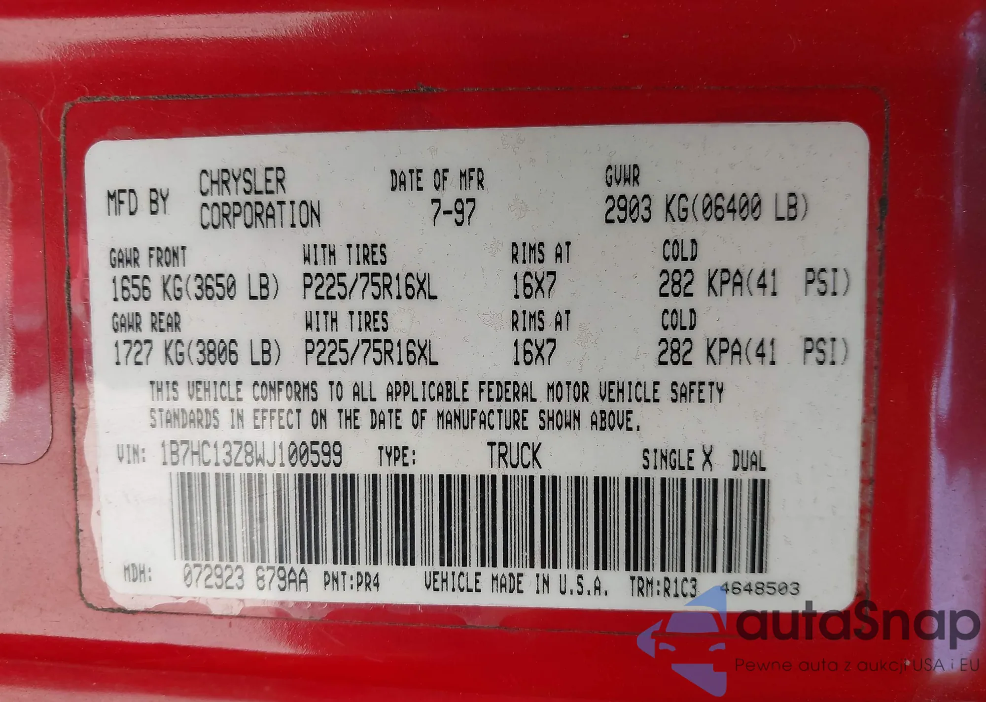• VIN 1B7HC13Z8WJ100599