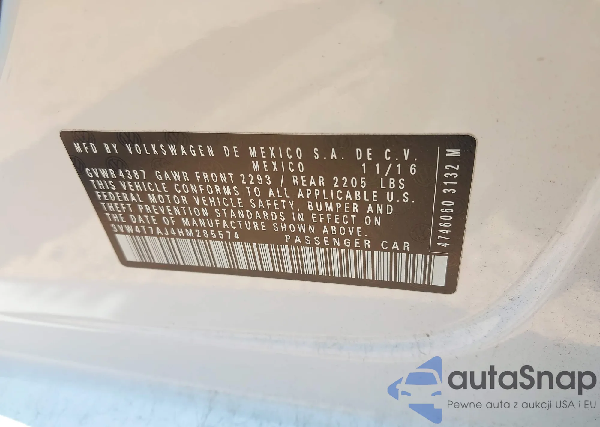 • VIN 3VW4T7AJ4HM285574
