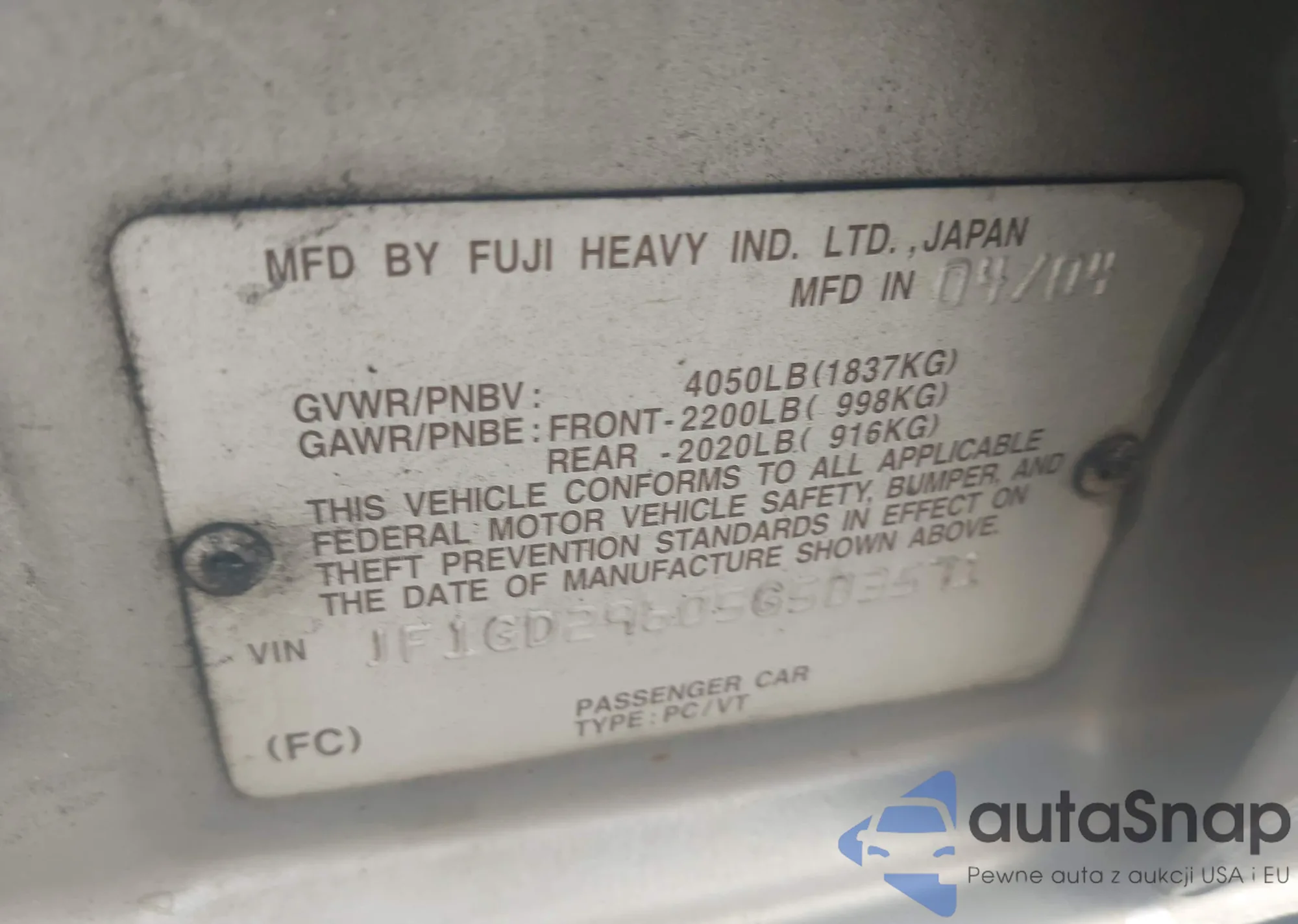 LOT: 42614002 VIN: JF1GD29605G503571