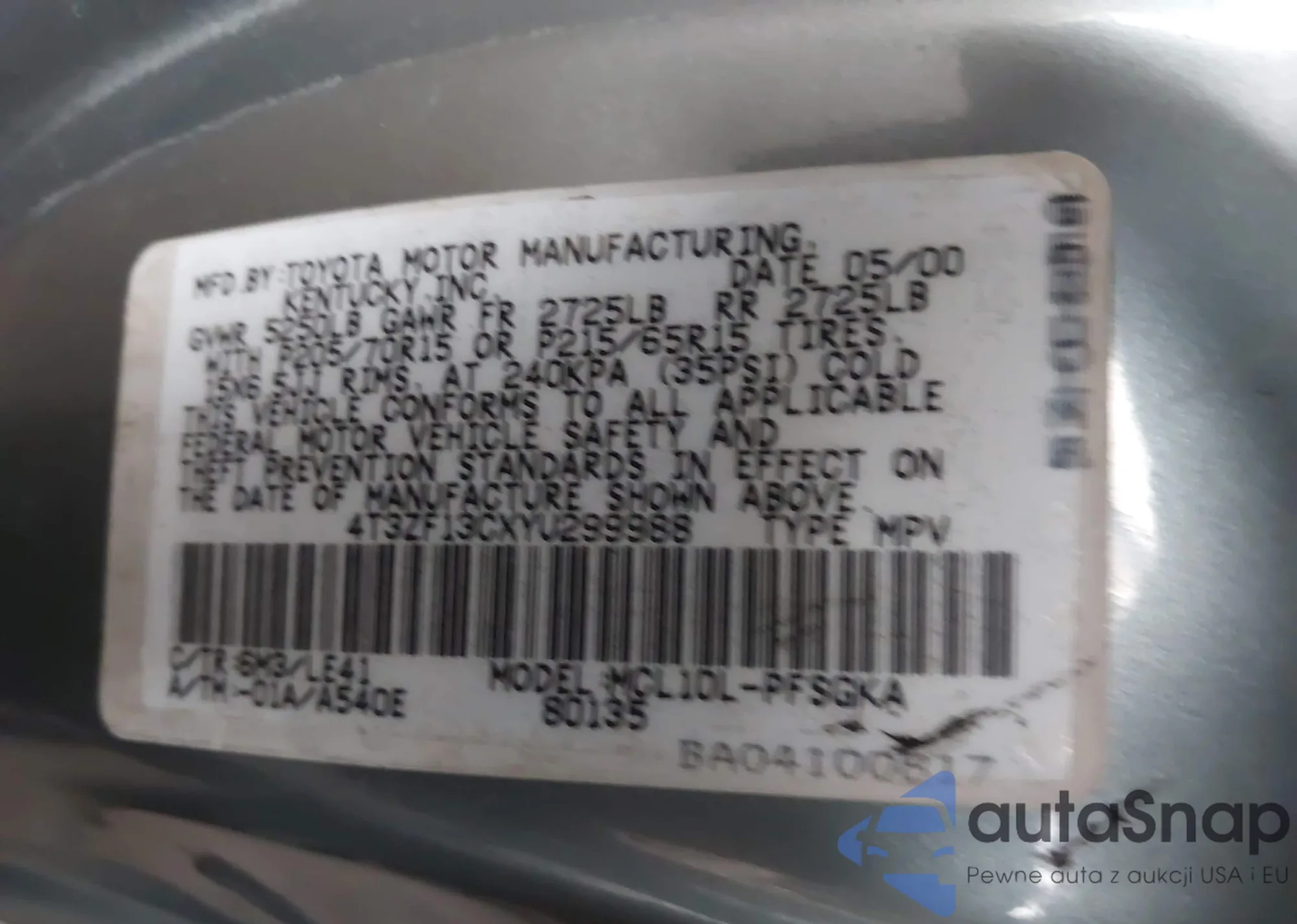 LOT: 42629949 VIN: 4T3ZF13CXYU299988