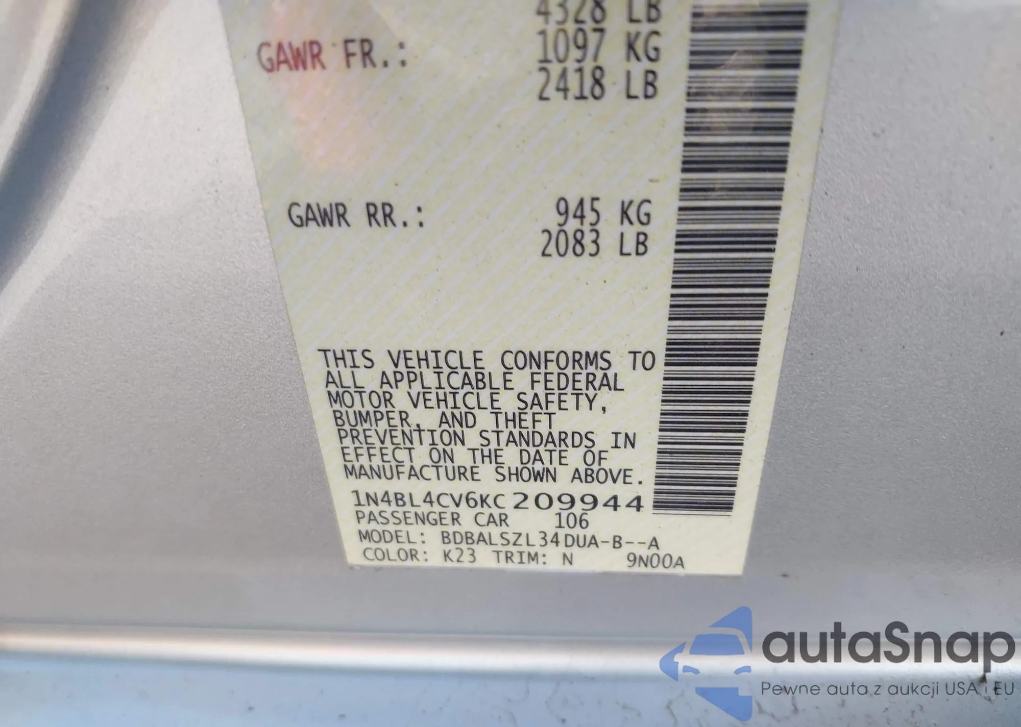 LOT: 42577850 VIN: 1N4BL4CV6KC209944
