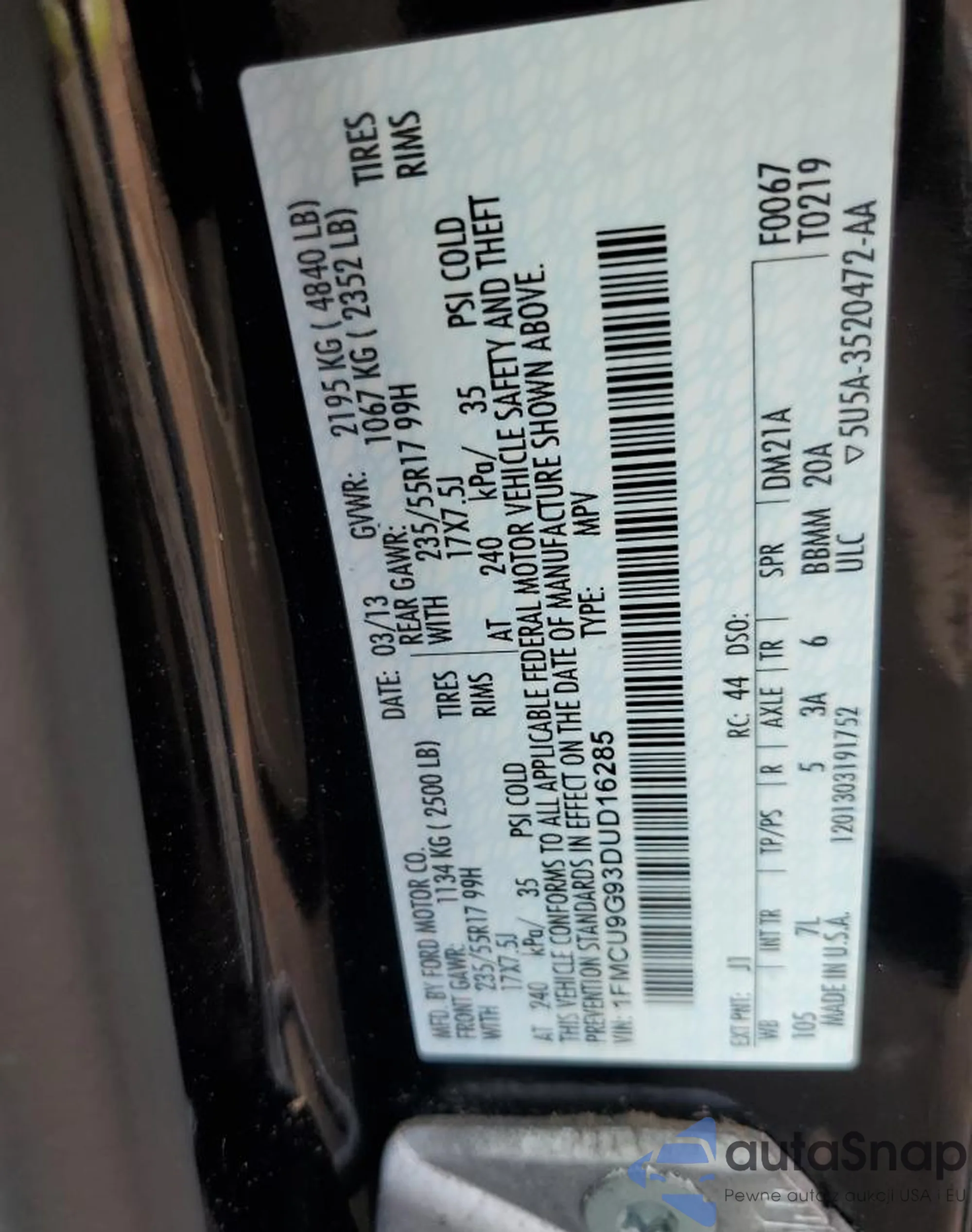 LOT: 61457845 VIN: 1FMCU9G93DUD16285