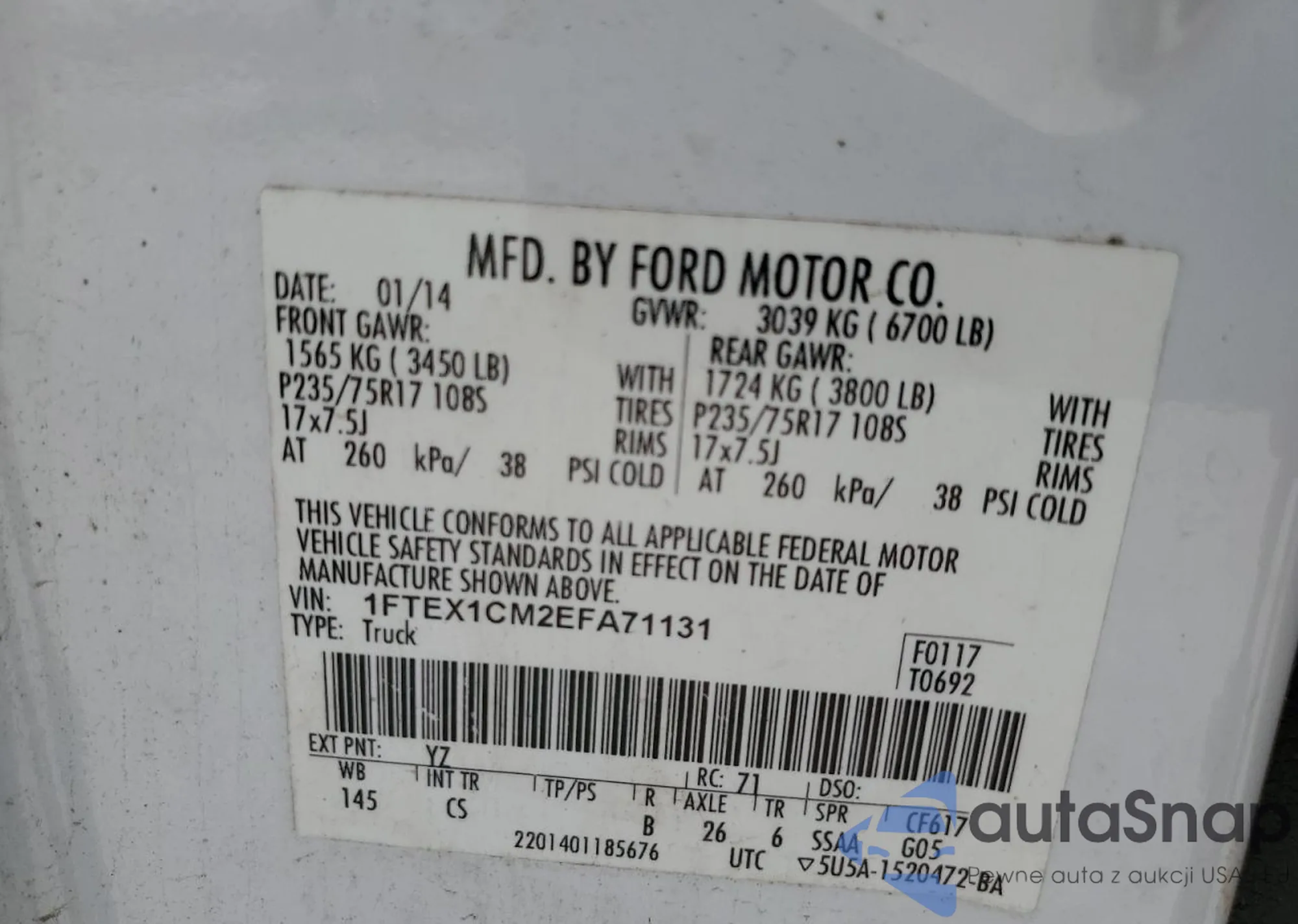 LOT: 59806735 VIN: 1FTEX1CM2EFA71131