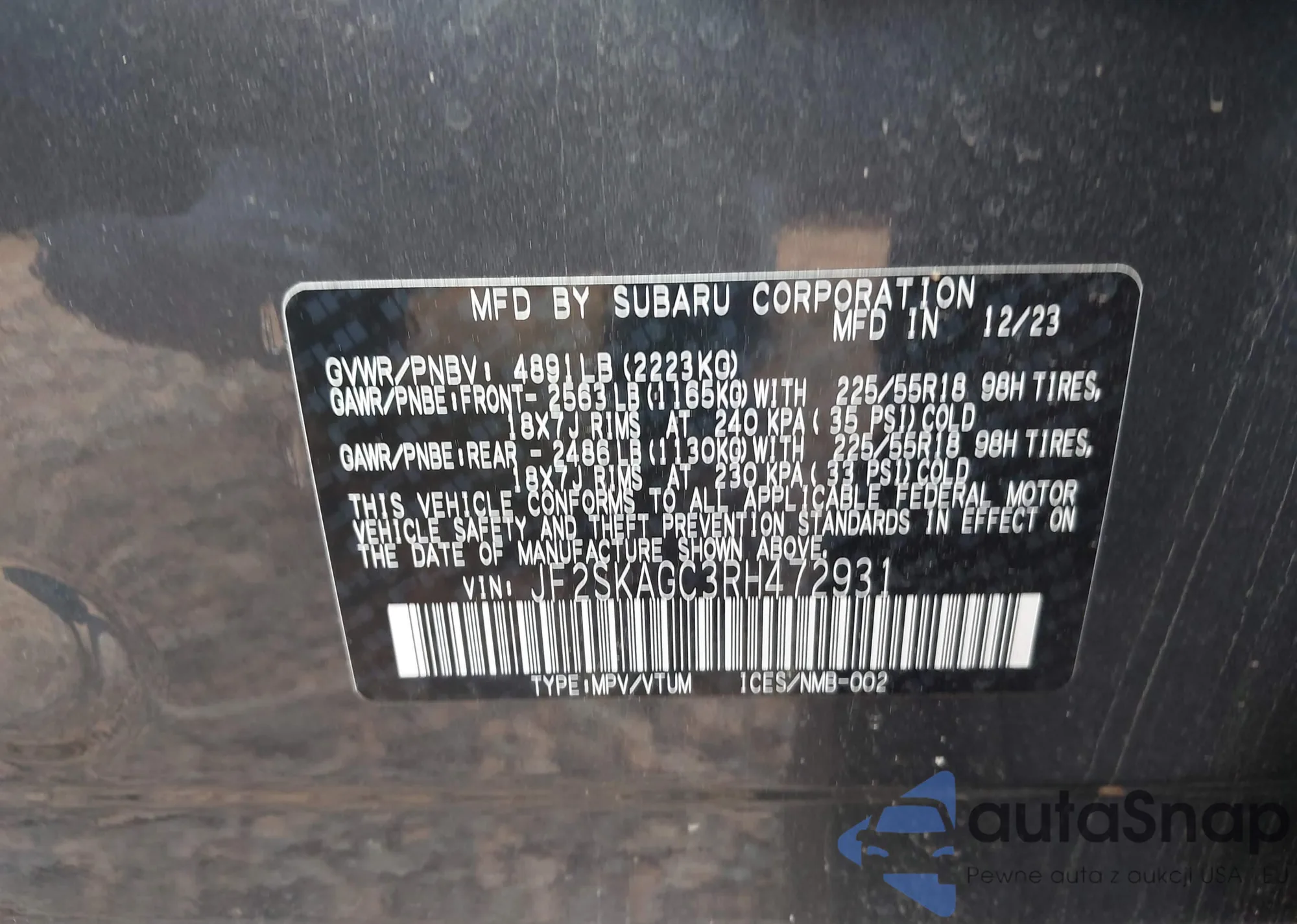 LOT: 42018991 VIN: JF2SKAGC3RH472931