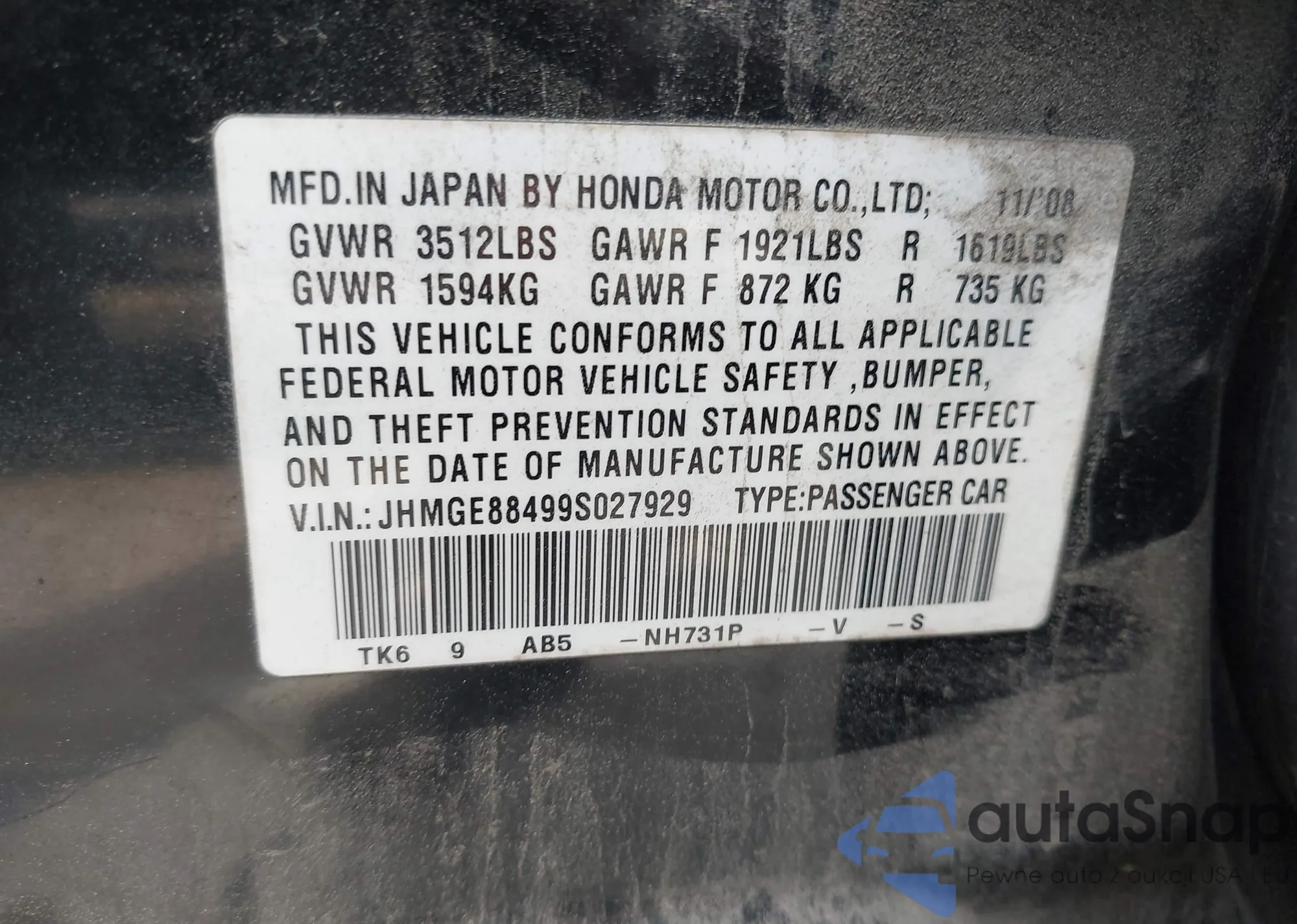• VIN JHMGE88499S027929