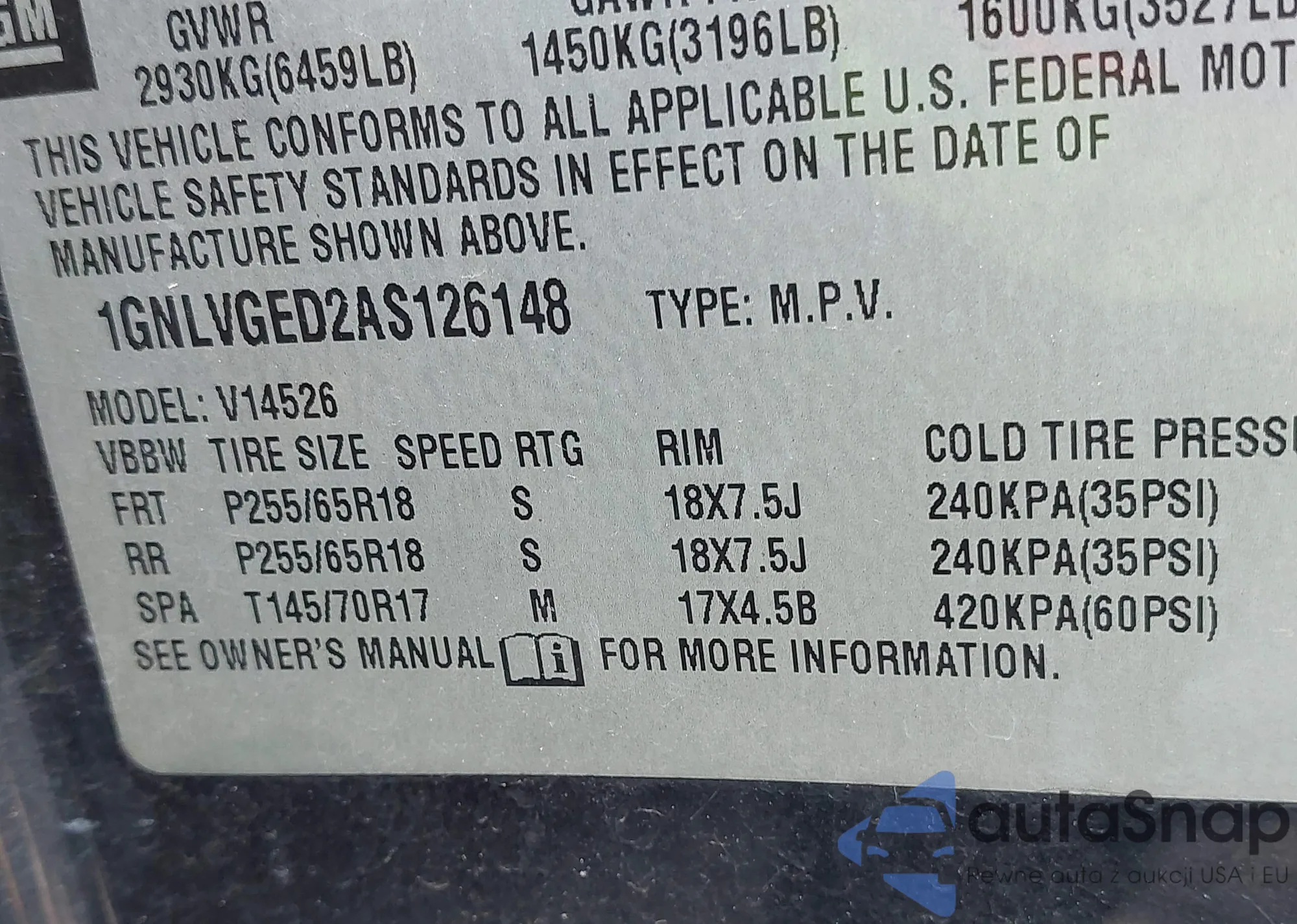 LOT: 42595969 VIN: 1GNLVGED2AS126148