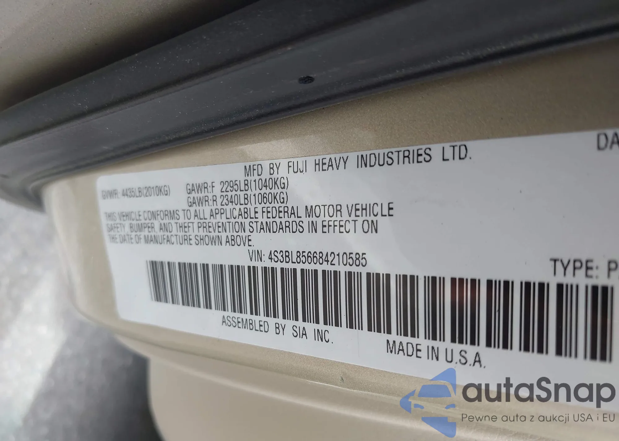 • VIN 4S3BL856684210585
