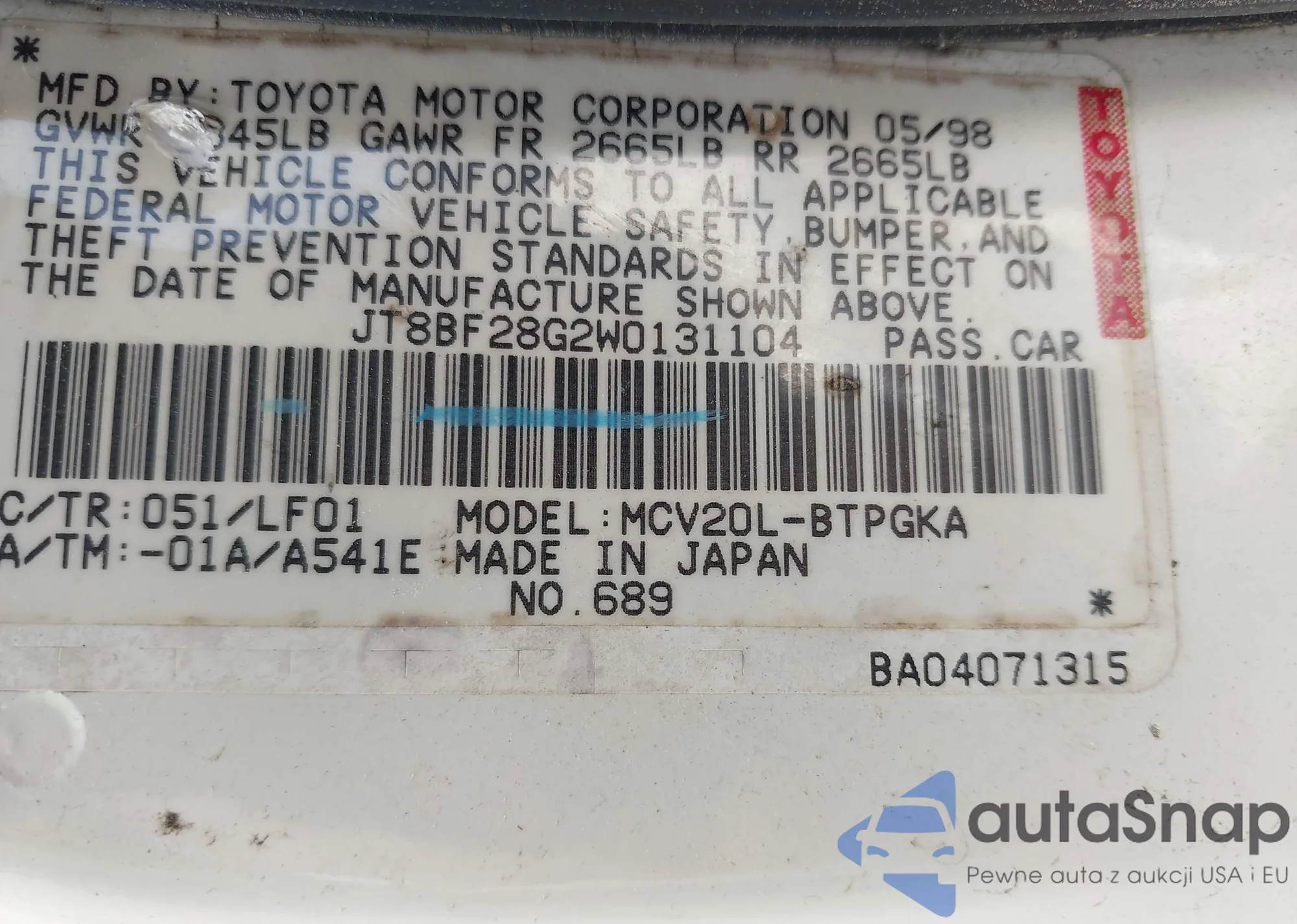 LOT: 42680242 VIN: JT8BF28G2W0131104