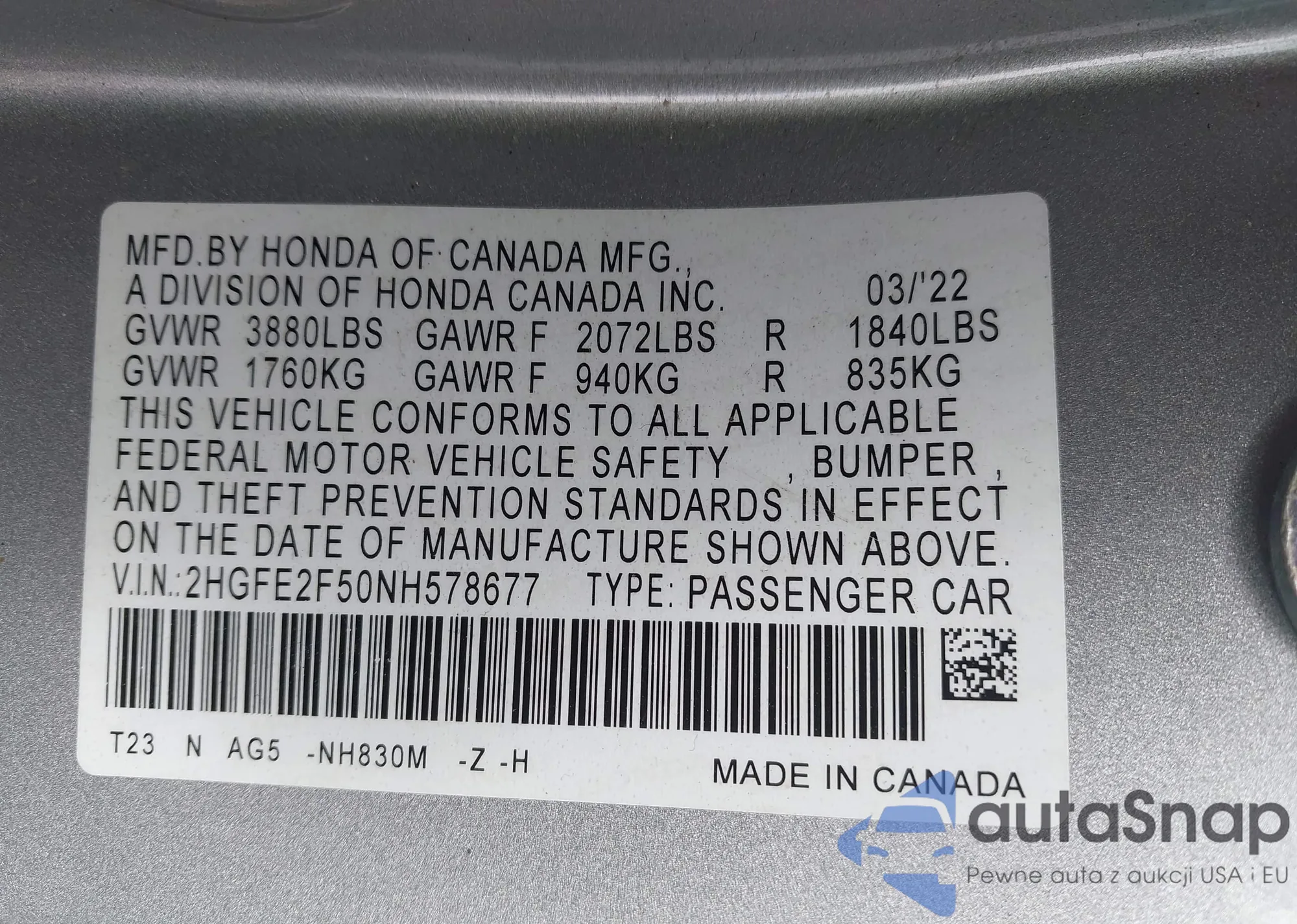 2022 Honda Civic Sport z USA, uszkodzony, nr VIN 2HGFE2F50NH578677