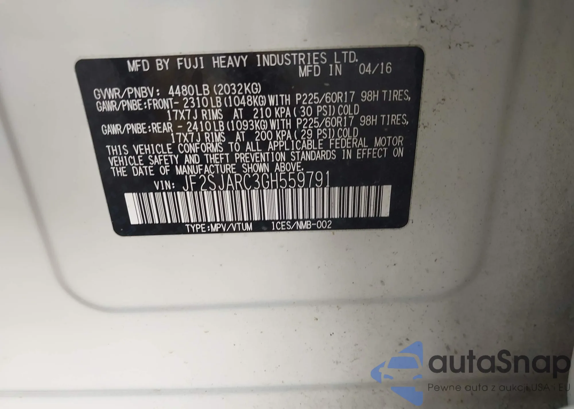 LOT: 42414130 VIN: JF2SJARC3GH559791