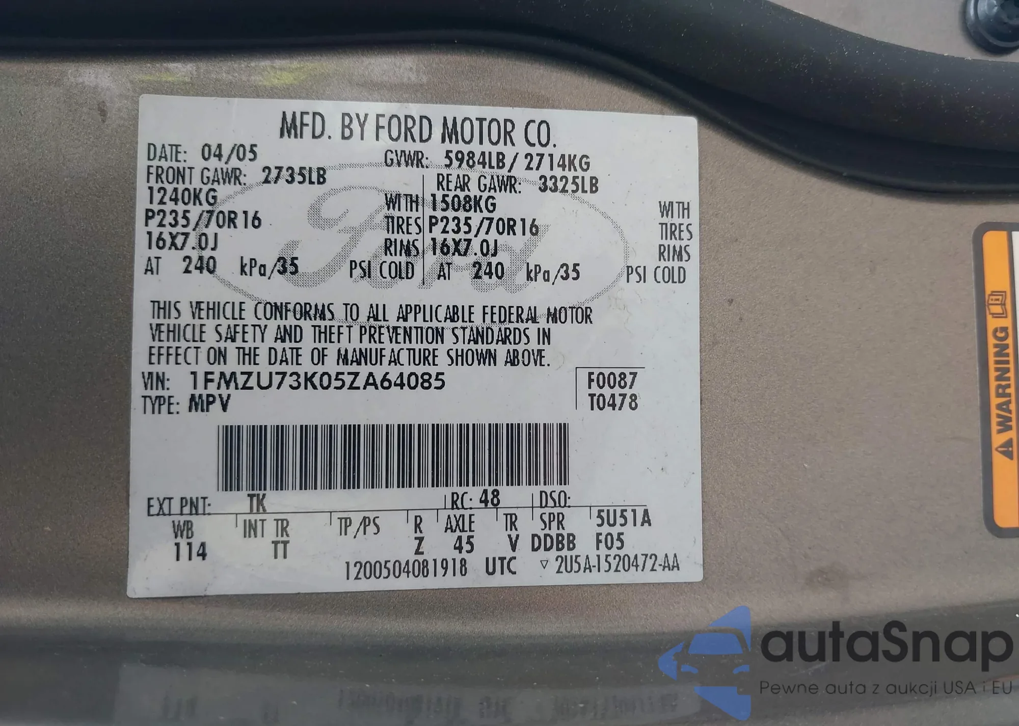LOT: 42717487 VIN: 1FMZU73K05ZA64085