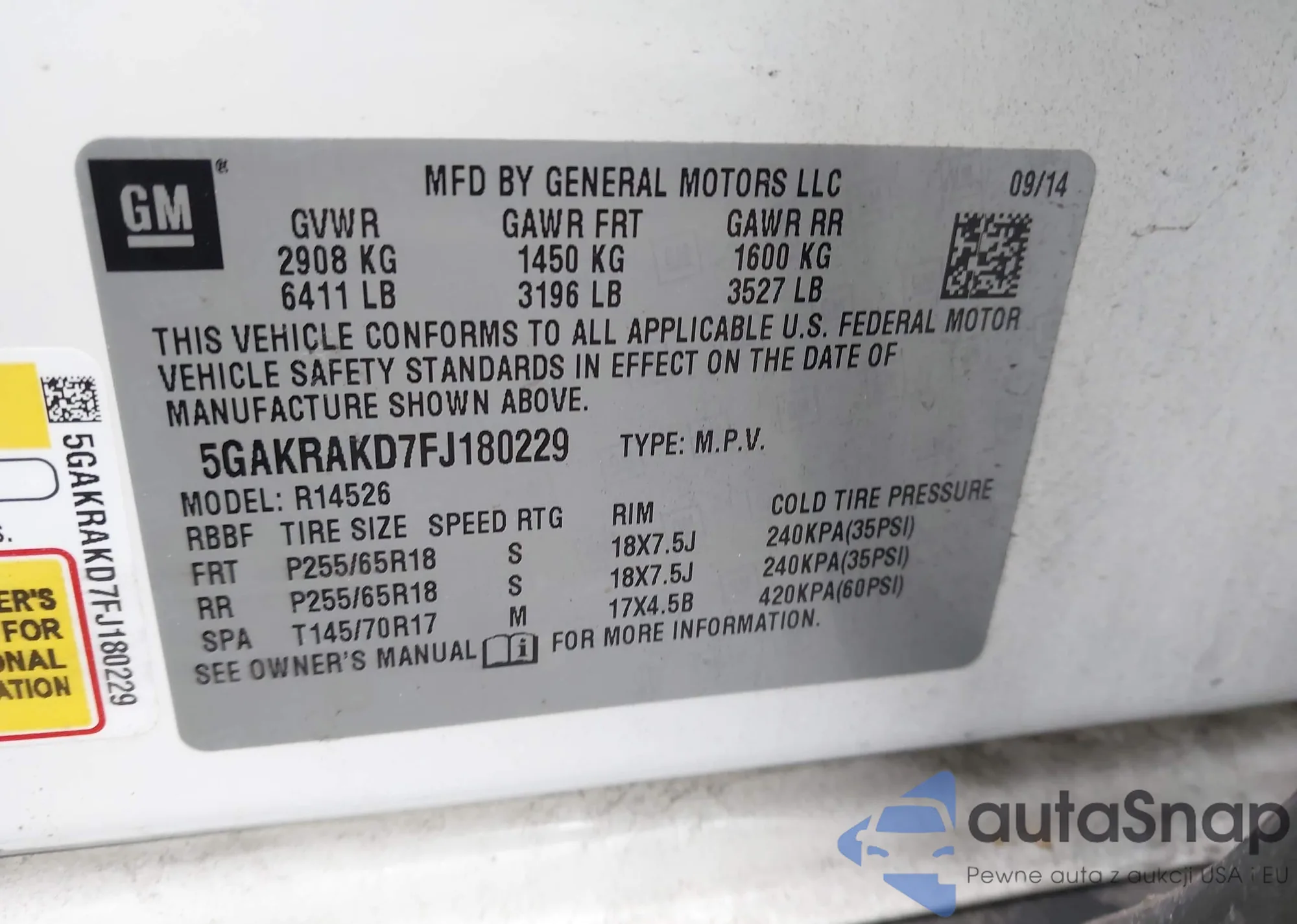 • VIN 5GAKRAKD7FJ180229