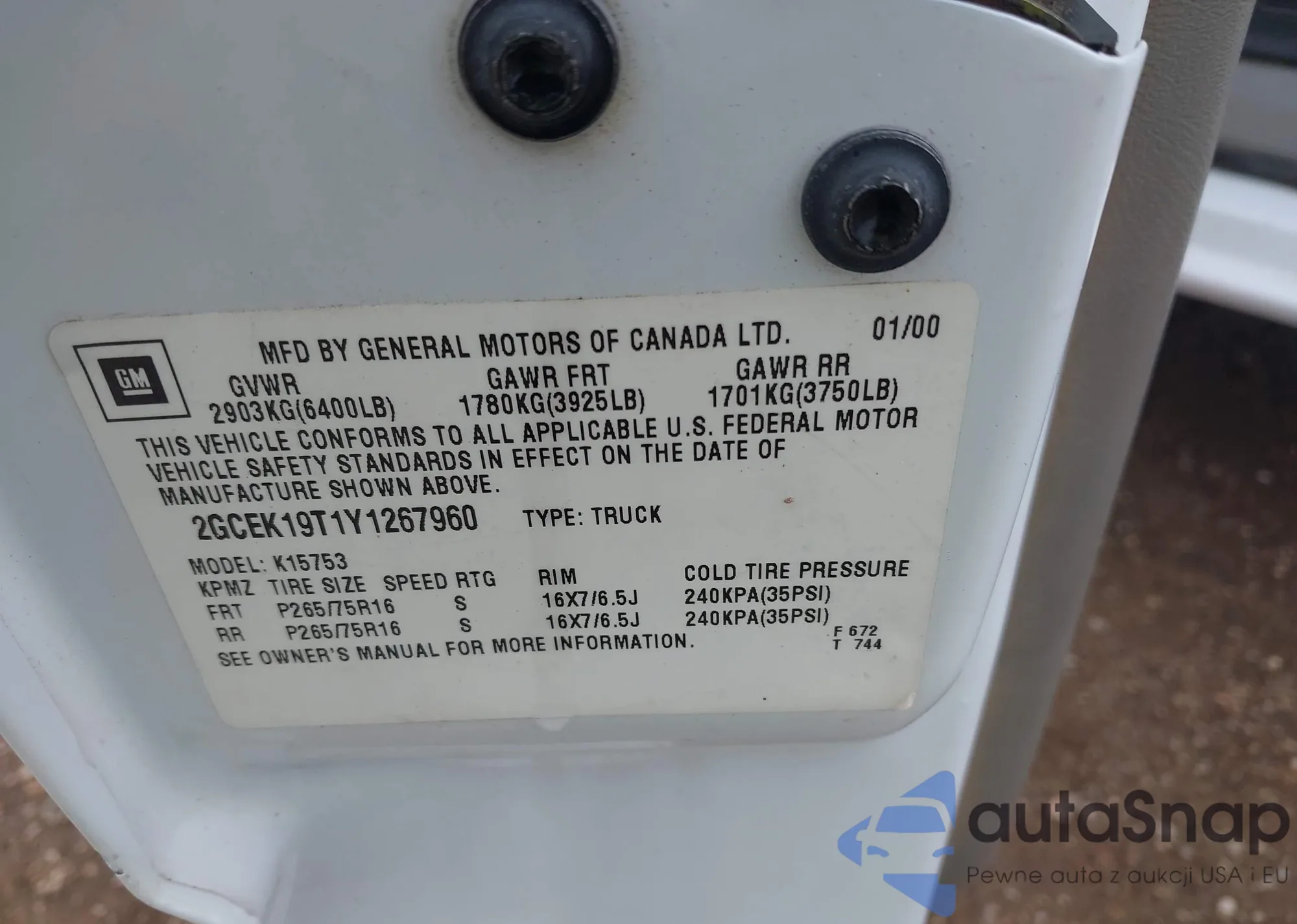 • VIN 2GCEK19T1Y1267960