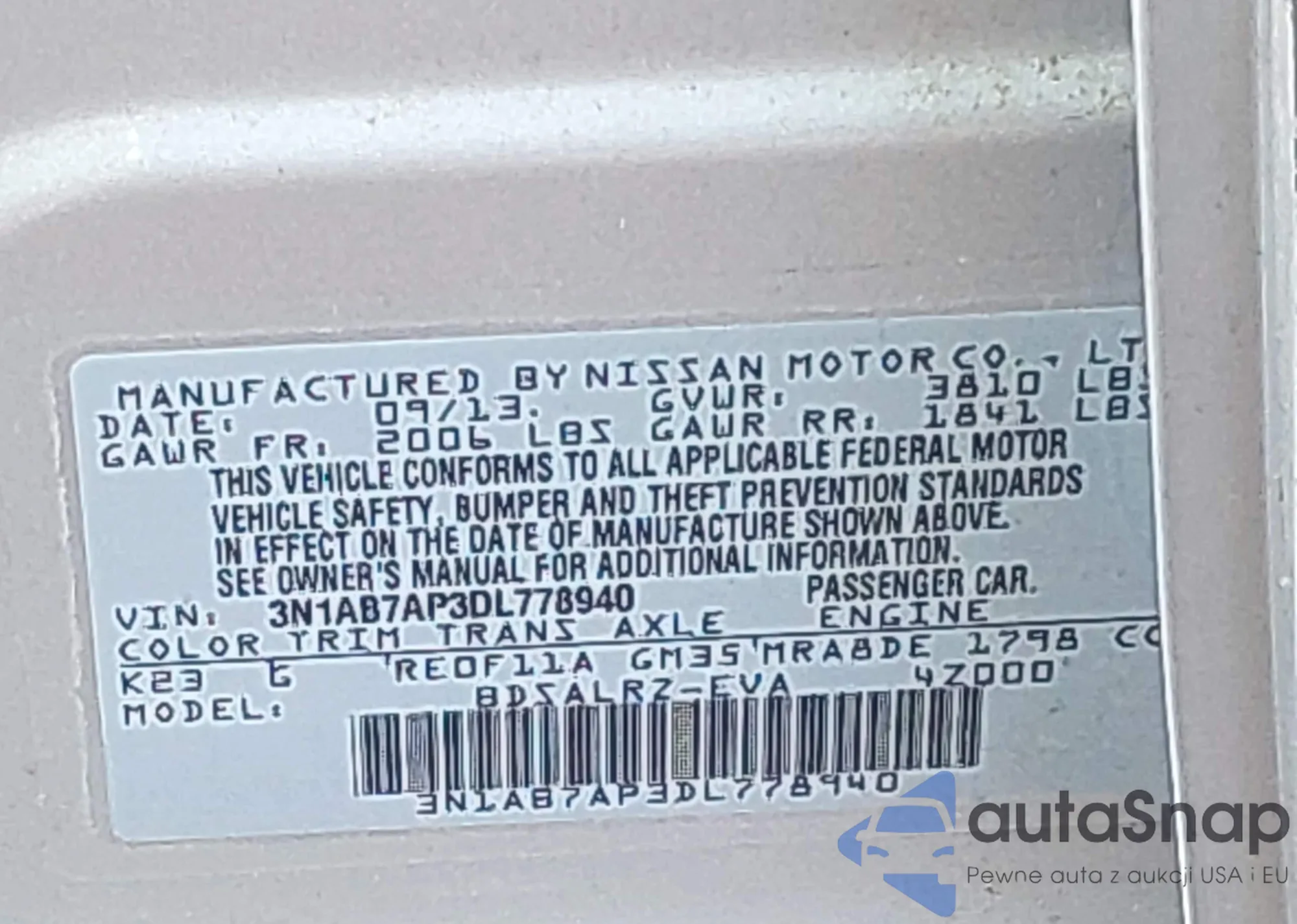 • VIN 3N1AB7AP3DL778940
