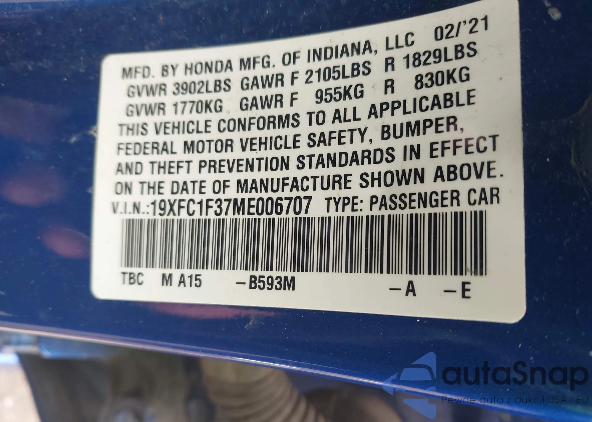 • VIN 19XFC1F37ME006707