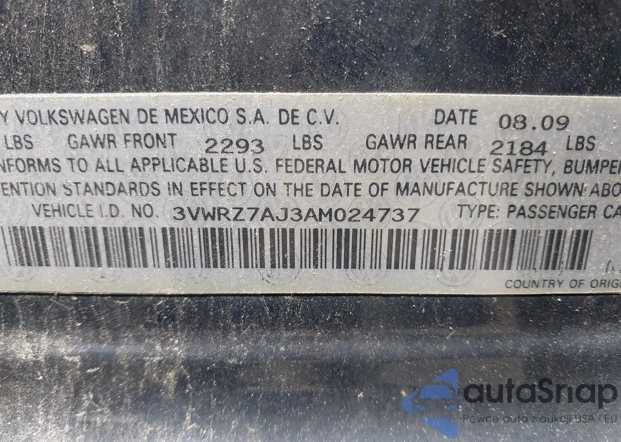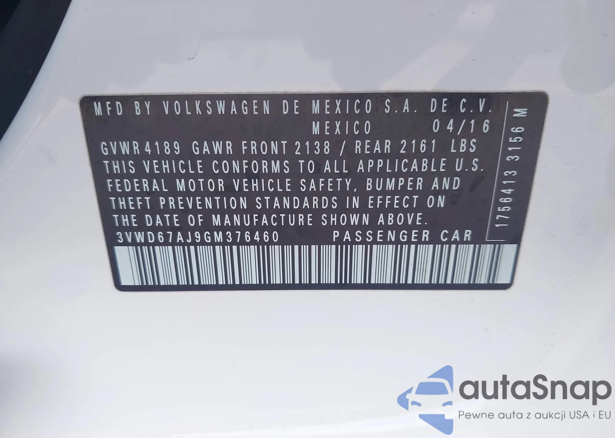 • VIN 3VWD67AJ9GM376460