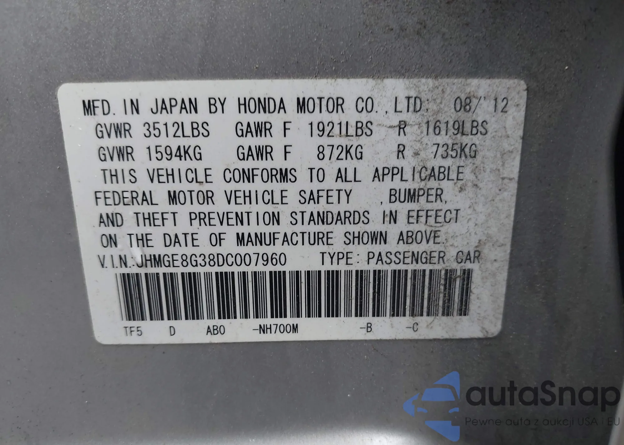LOT: 42619224 VIN: JHMGE8G38DC007960