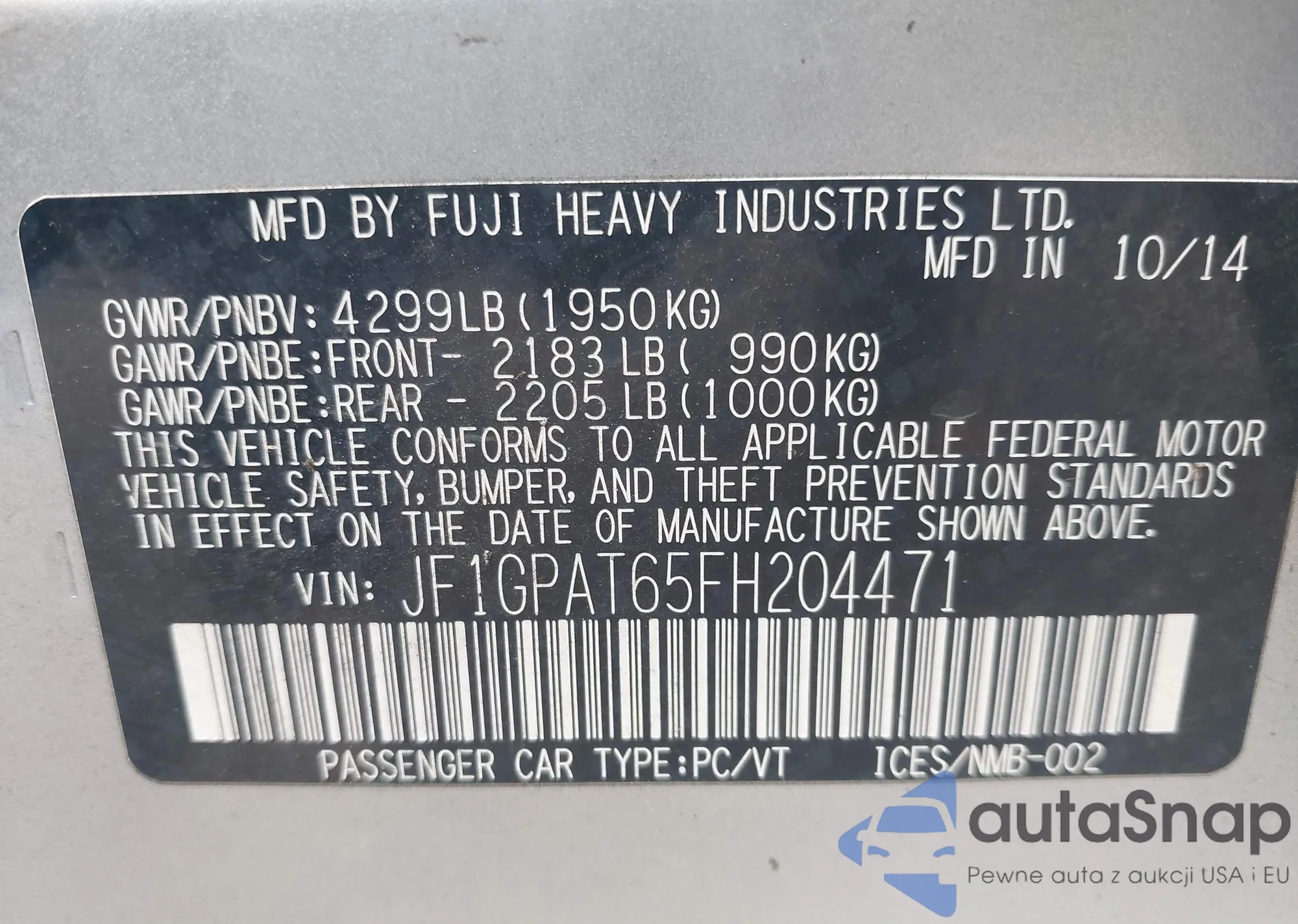 LOT: 42652657 VIN: JF1GPAT65FH204471