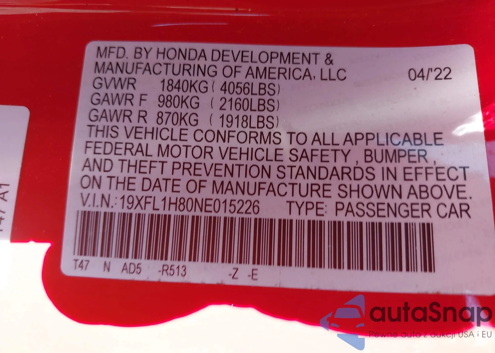 LOT: 41836375 VIN: 19XFL1H80NE015226