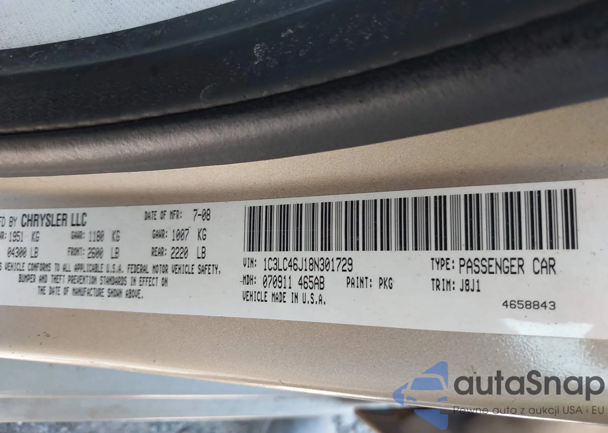 LOT: 42798627 VIN: 1C3LC46J18N301729