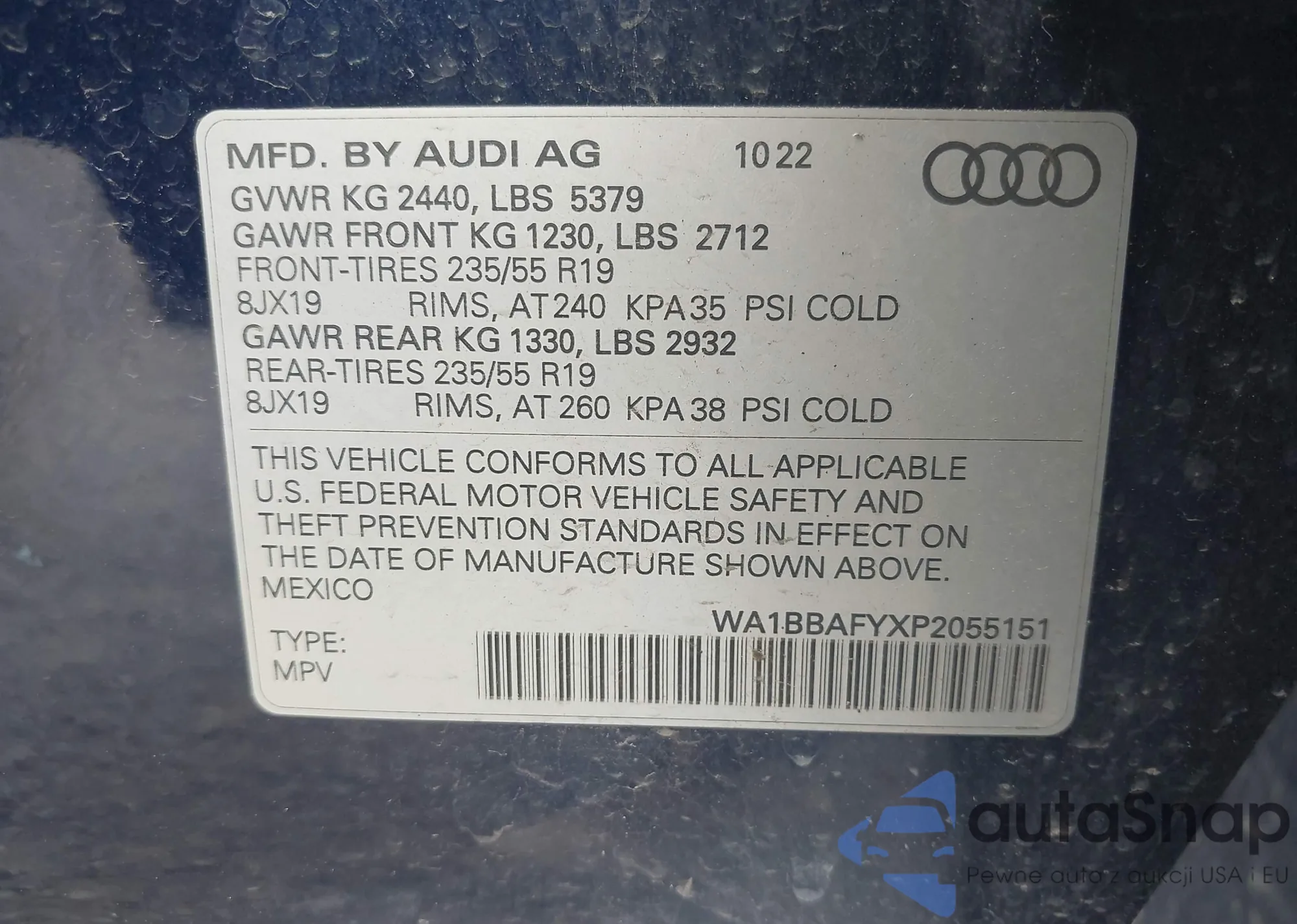 LOT: 42611314 VIN: WA1BBAFYXP2055151