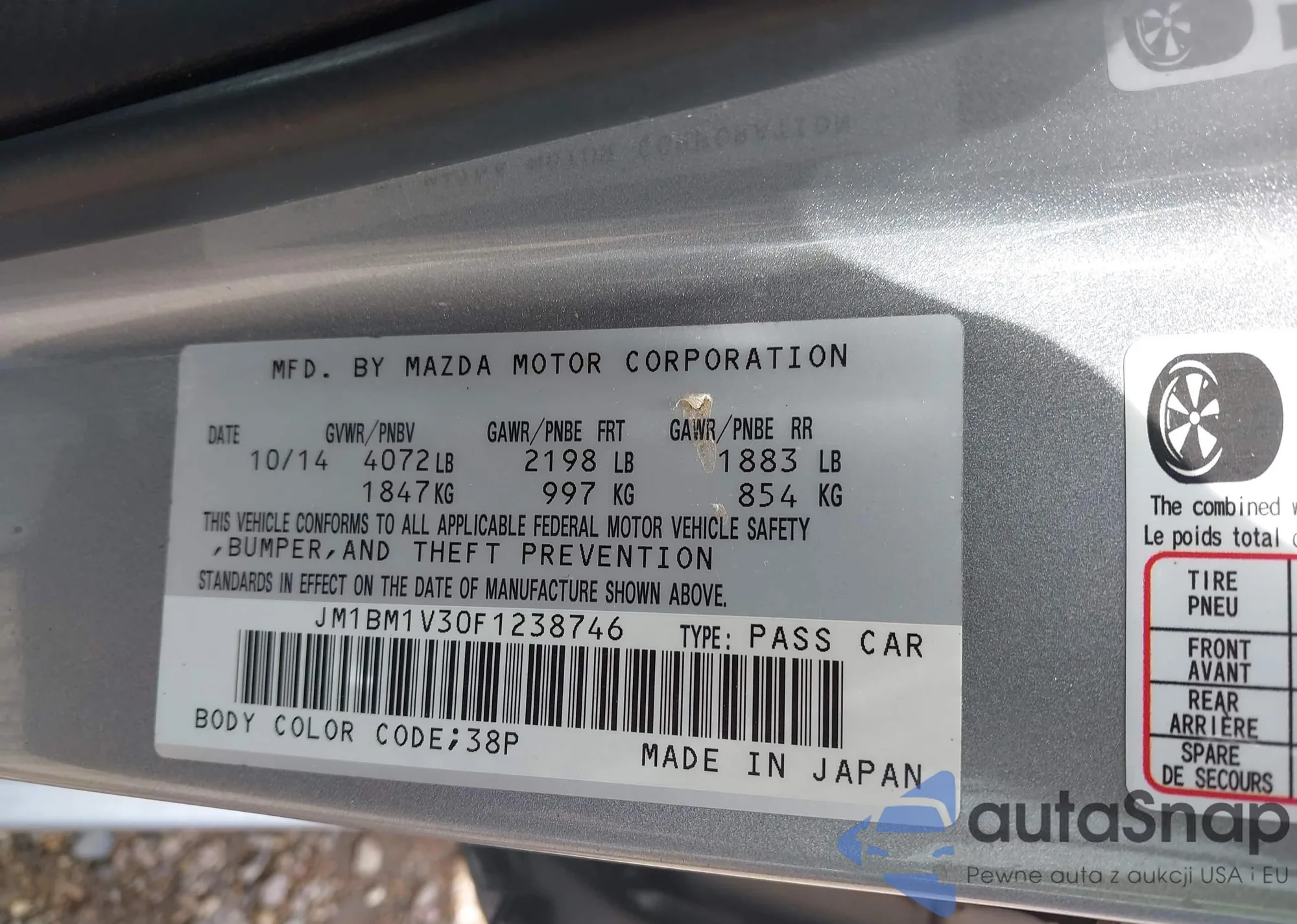 LOT: 42706452 VIN: JM1BM1V30F1238746
