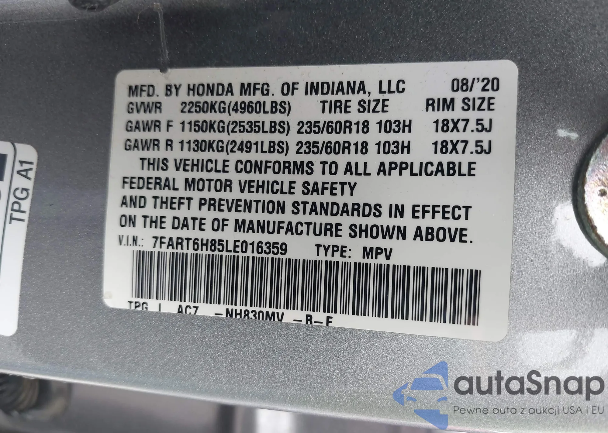 LOT: 42731477 VIN: 7FART6H85LE016359