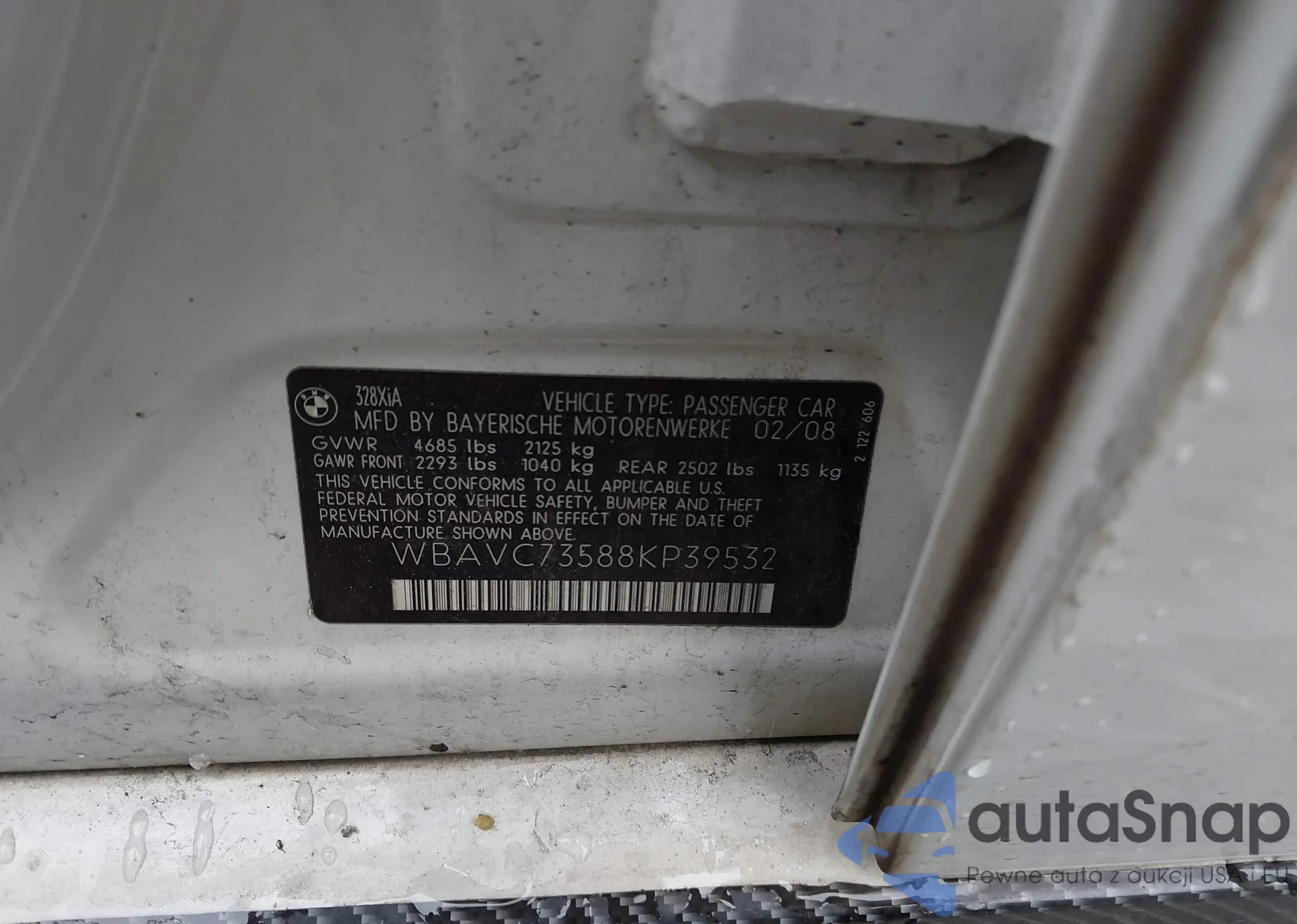 2008 BMW 328 z USA, uszkodzony, nr VIN WBAVC73588KP39532