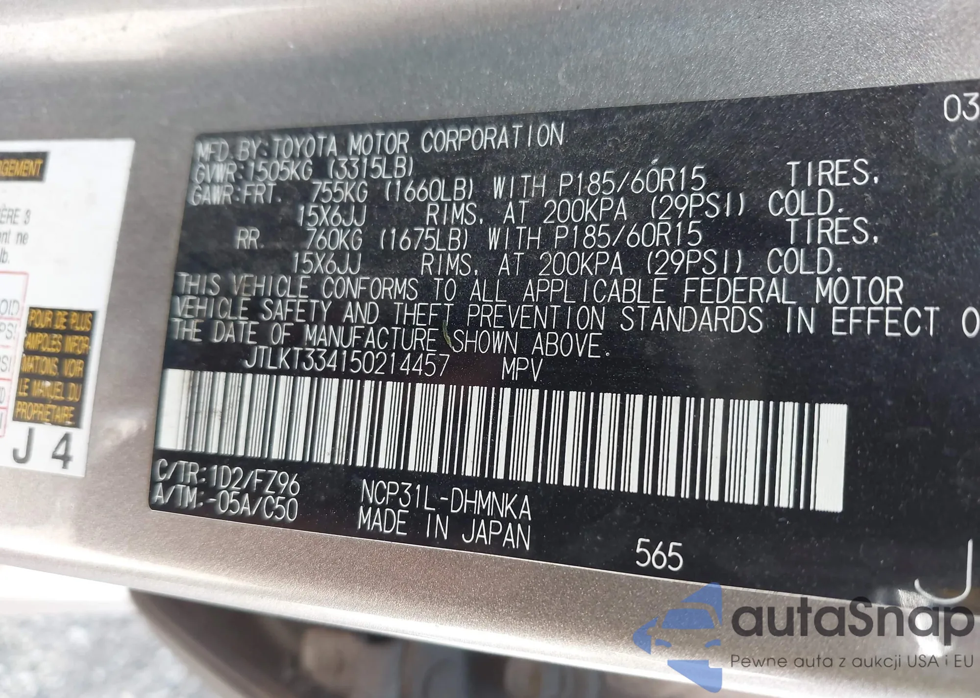 LOT: 42620293 VIN: JTLKT334150214457