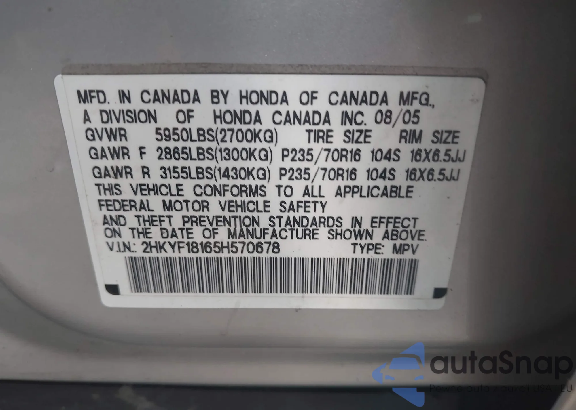 LOT: 42430668 VIN: JHMFE1F78NX004526