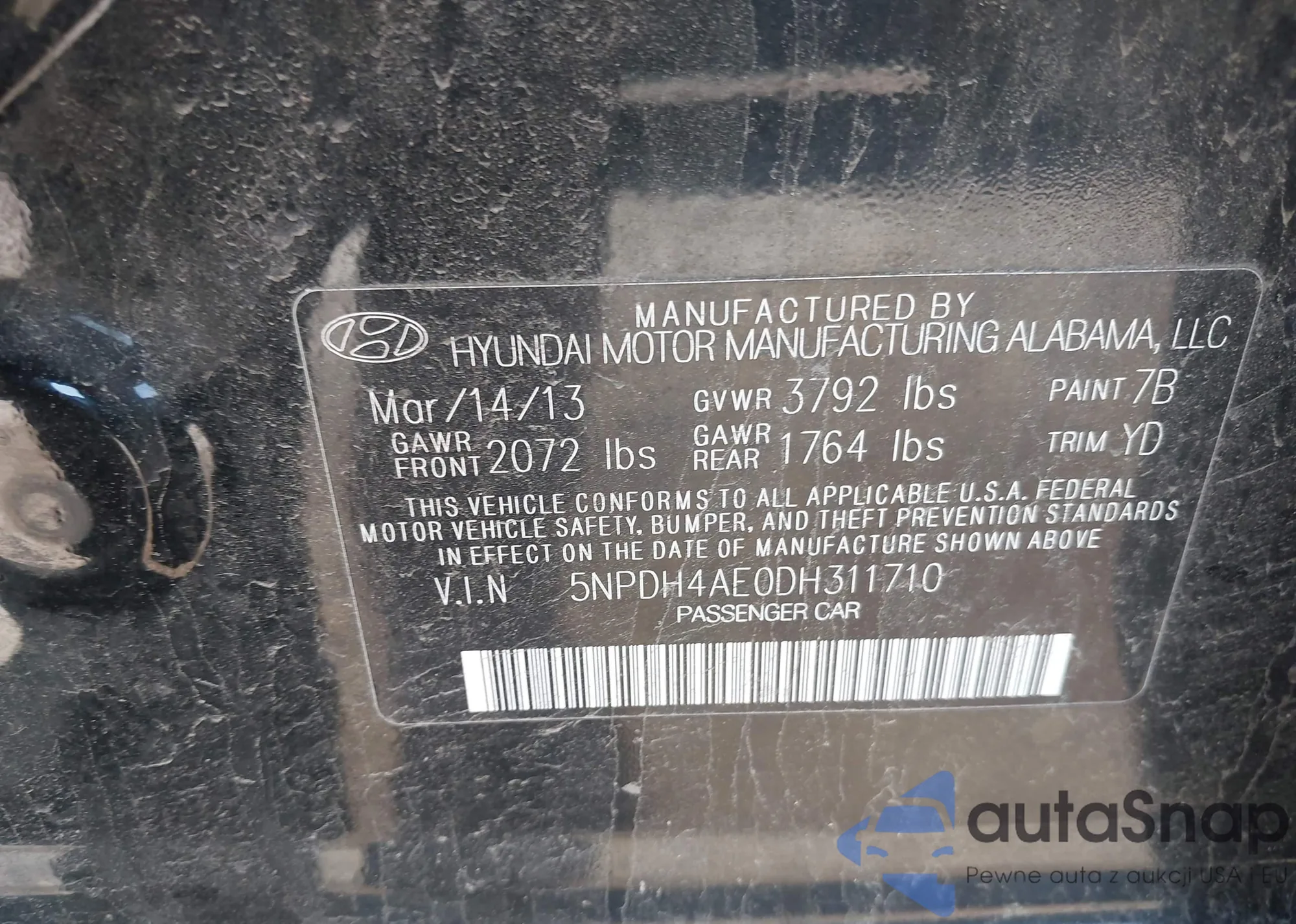 LOT: 42019425 VIN: 5NPDH4AE0DH311710