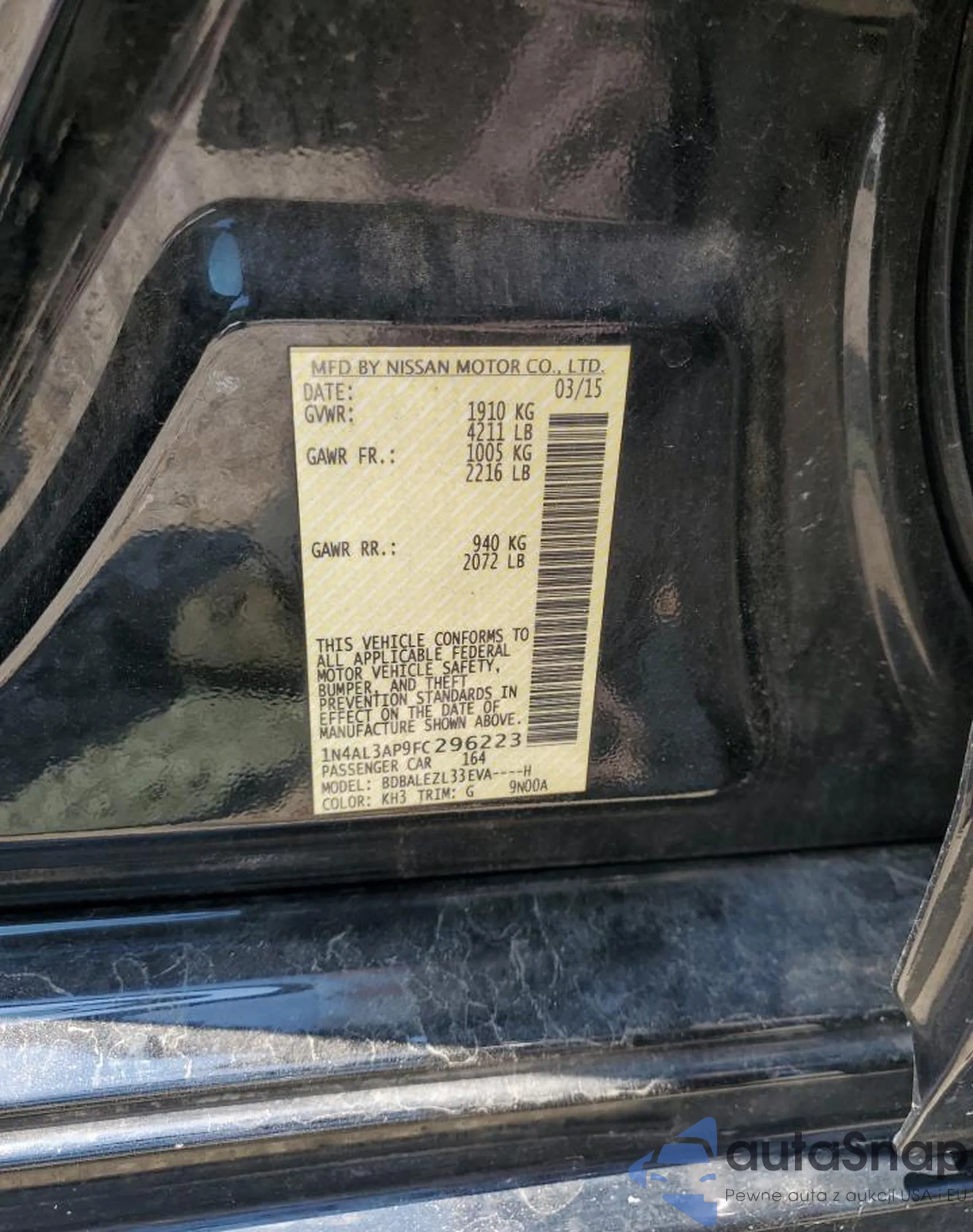 • VIN 1N4AL3AP9FC296223