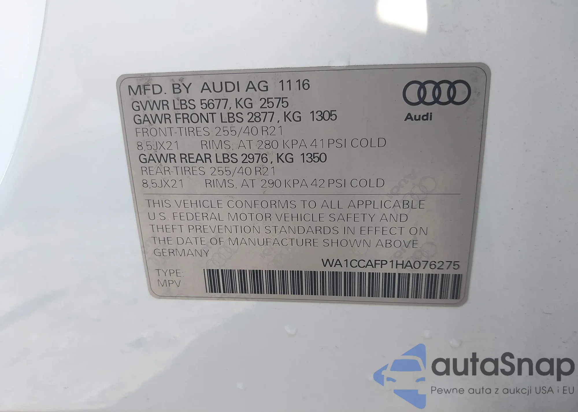 LOT: 42570356 VIN: WA1CCAFP1HA076275