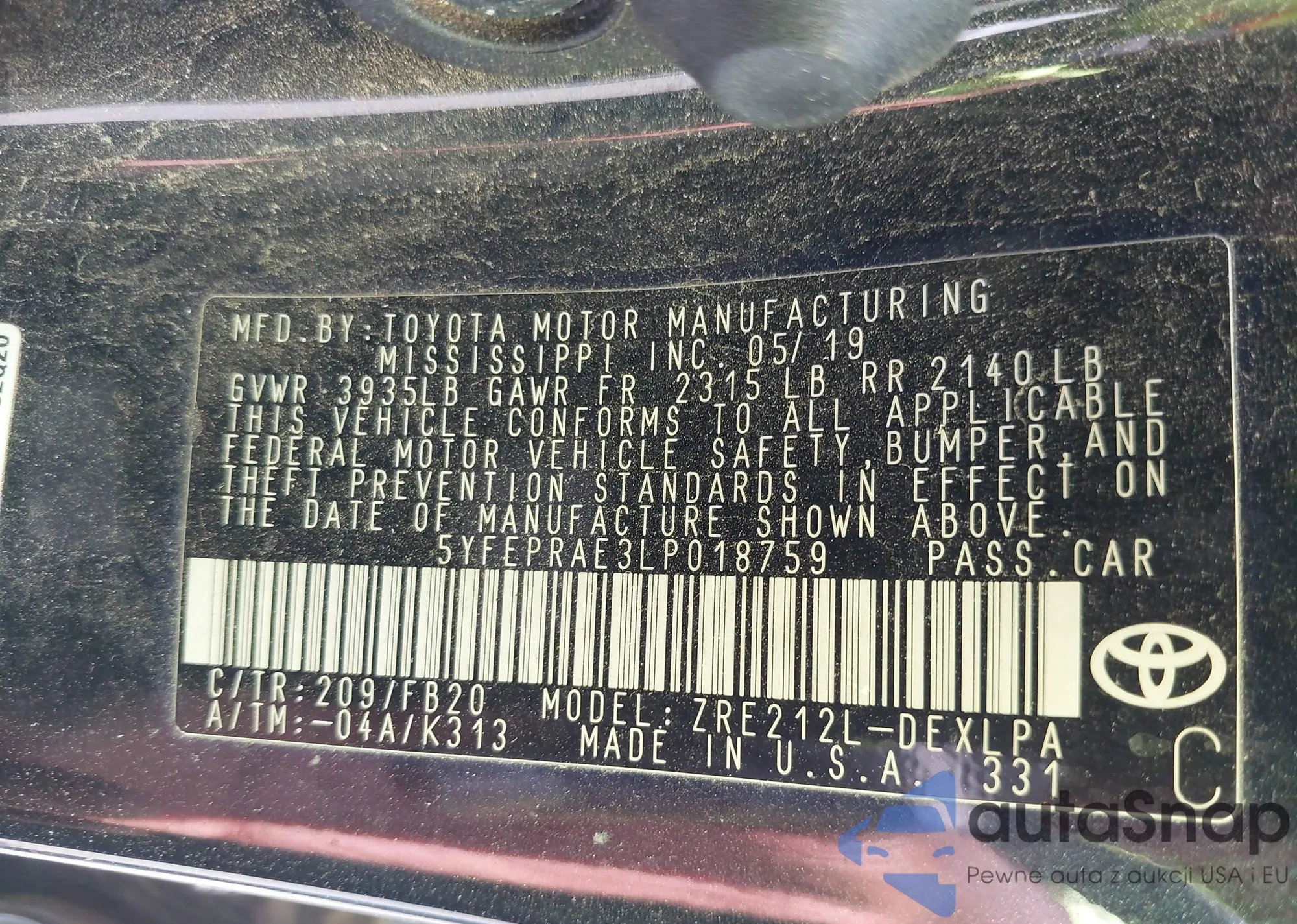 • VIN 5YFEPRAE3LP018759