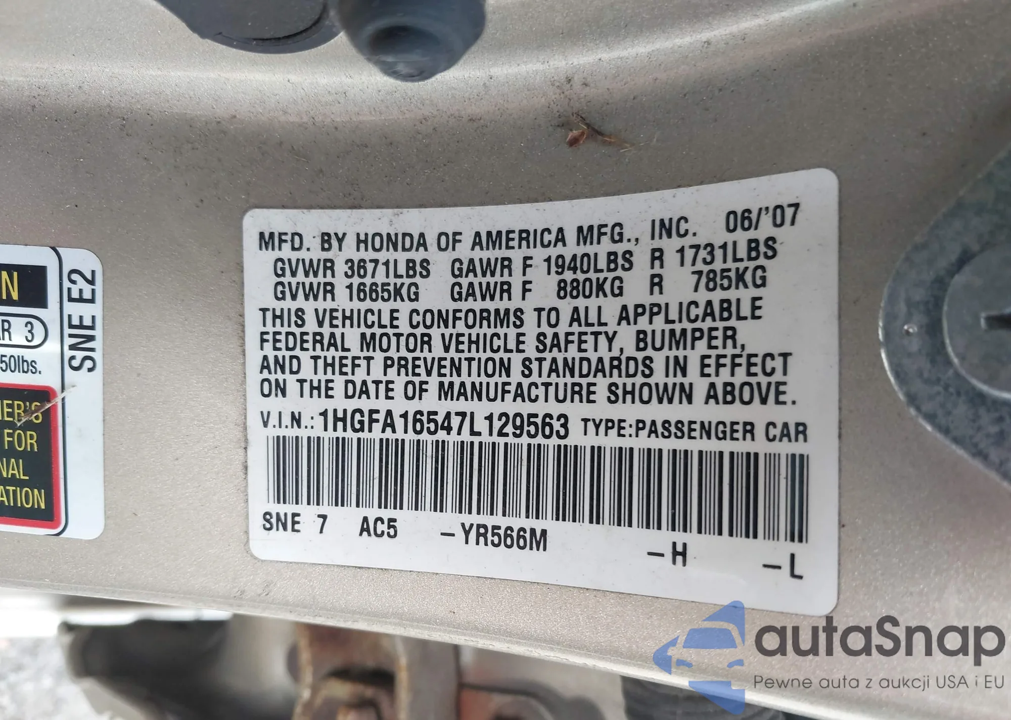 LOT: 42506700 VIN: 1HGFA16547L129563