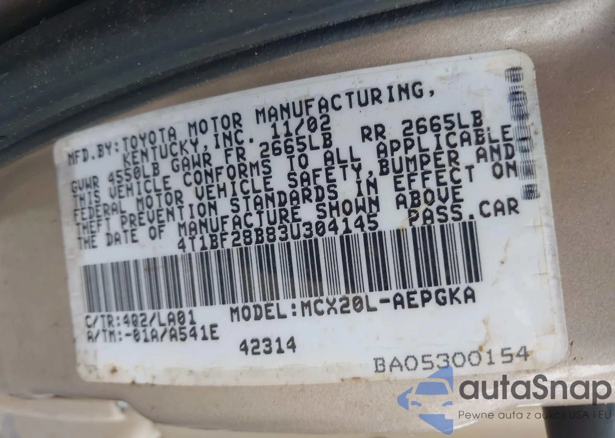 LOT: 42712819 VIN: 4T1BF28B83U304145