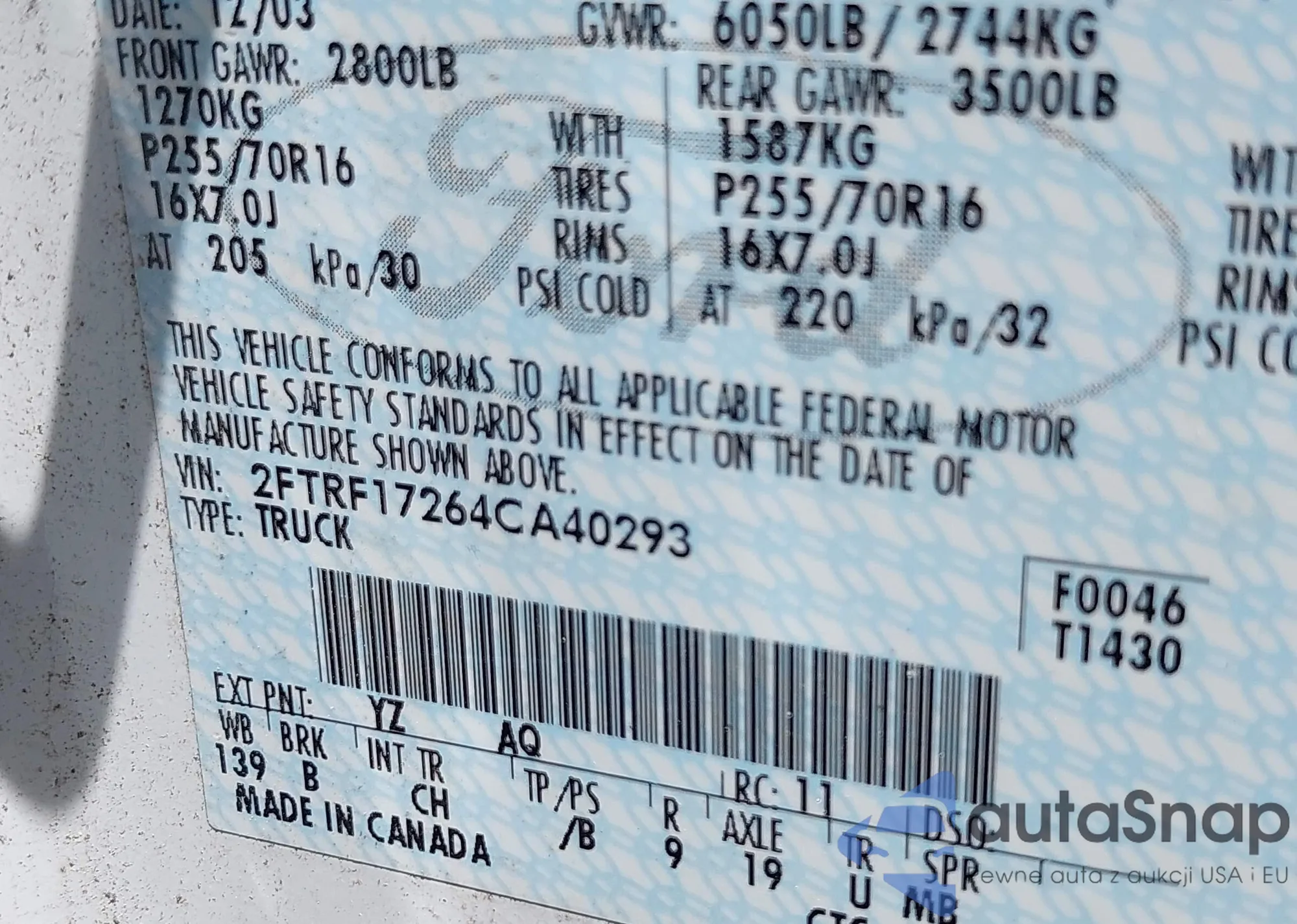 LOT: 42771784 VIN: 2FTRF17264CA40293