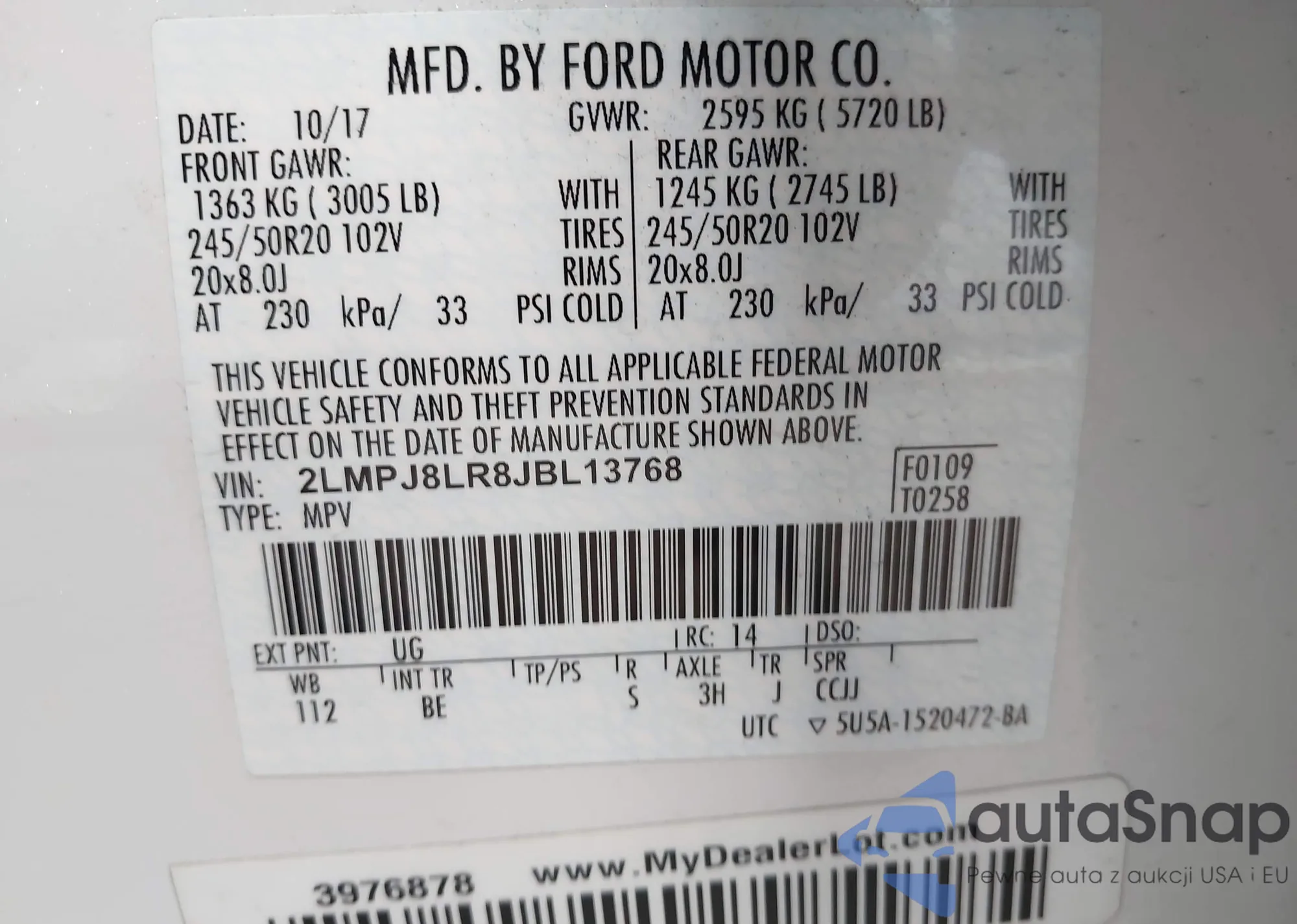 LOT: 42724761 VIN: 2LMPJ8LR8JBL13768
