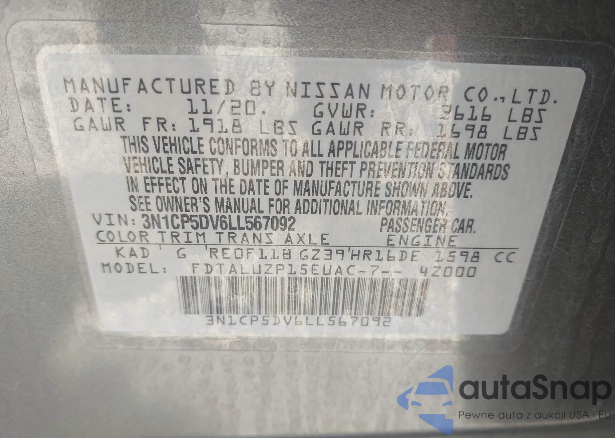 • VIN 3N1CP5DV6LL567092