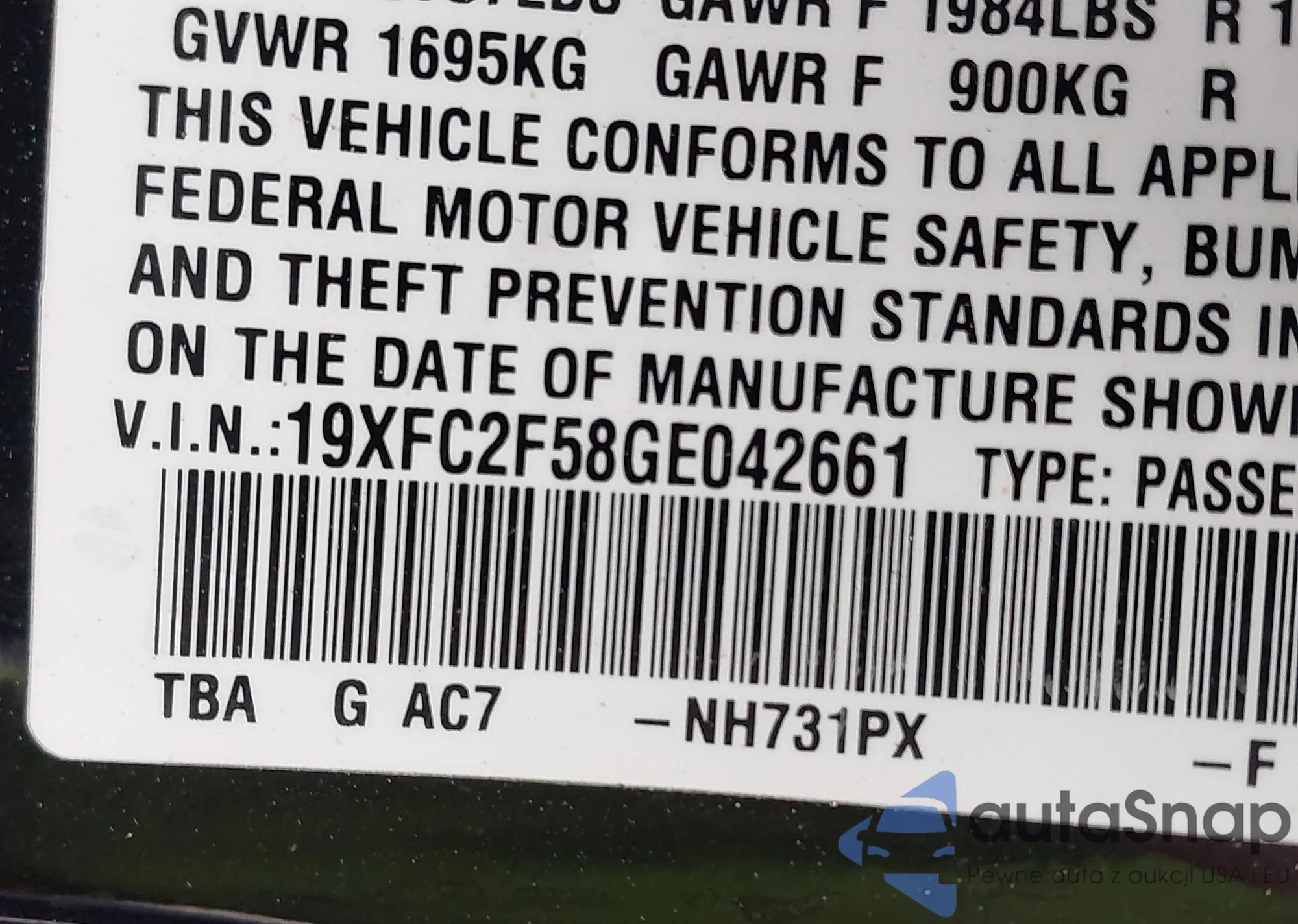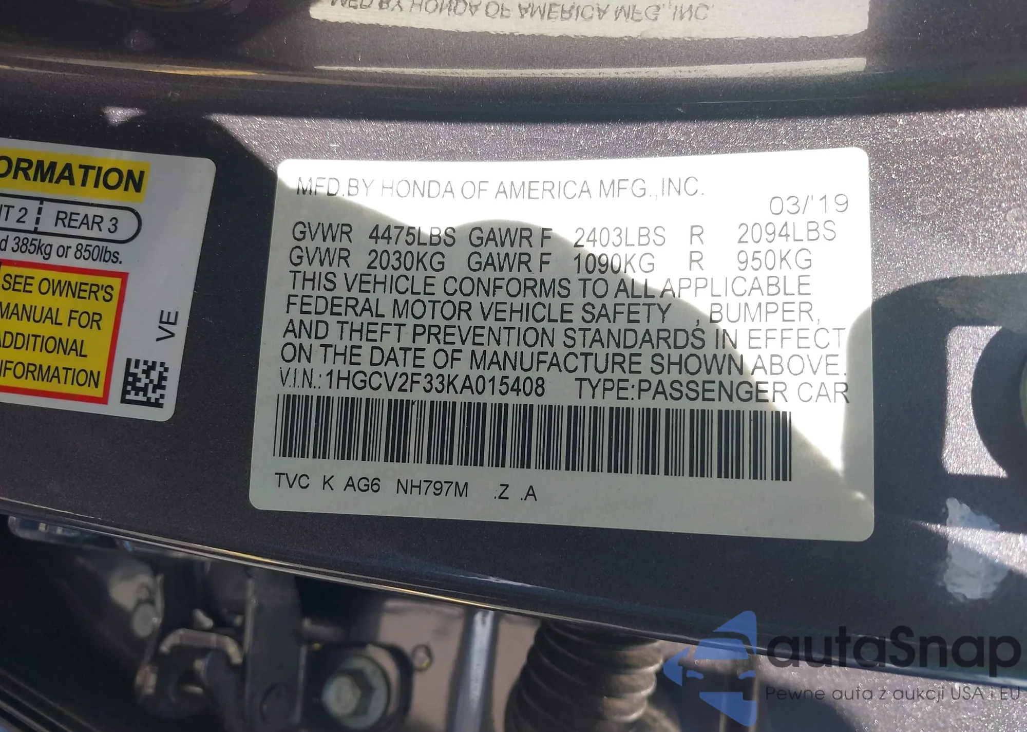 LOT: 42601670 VIN: 1HGCV2F33KA015408